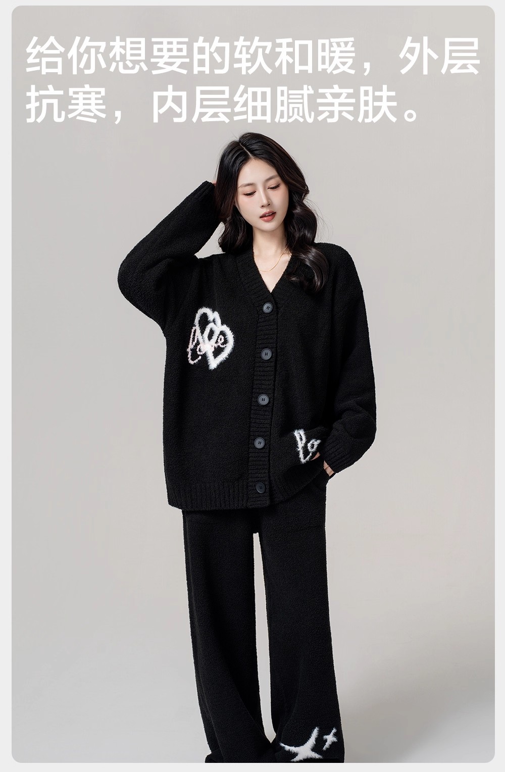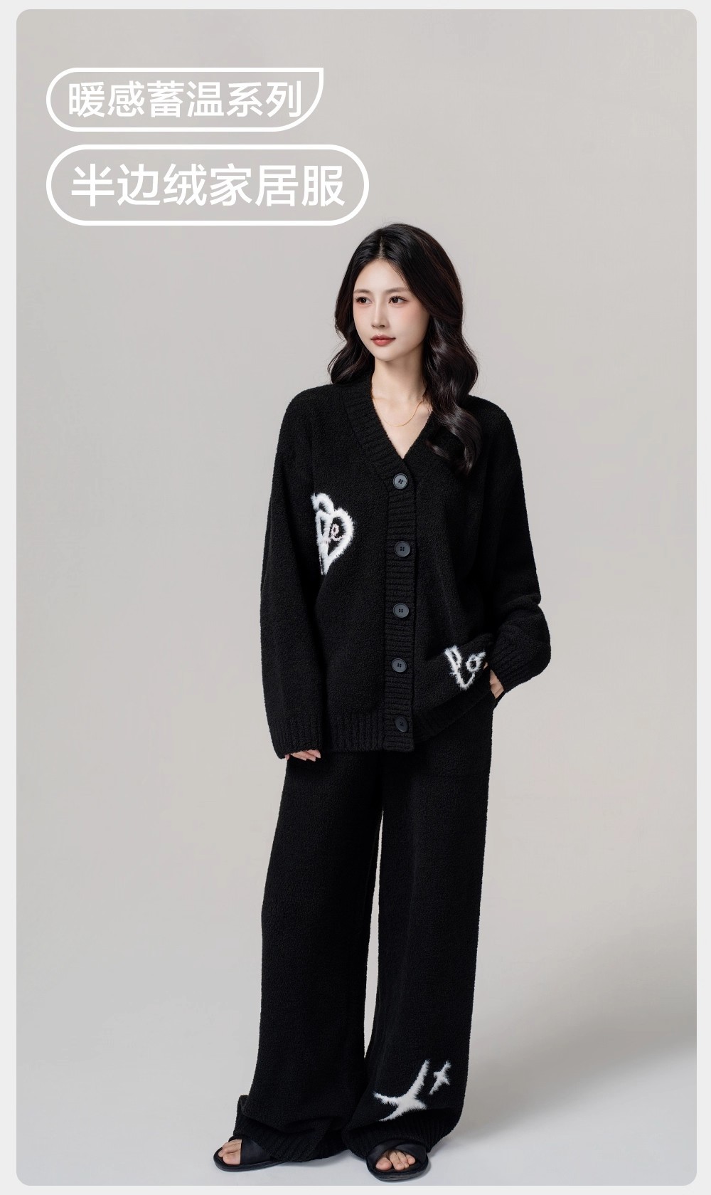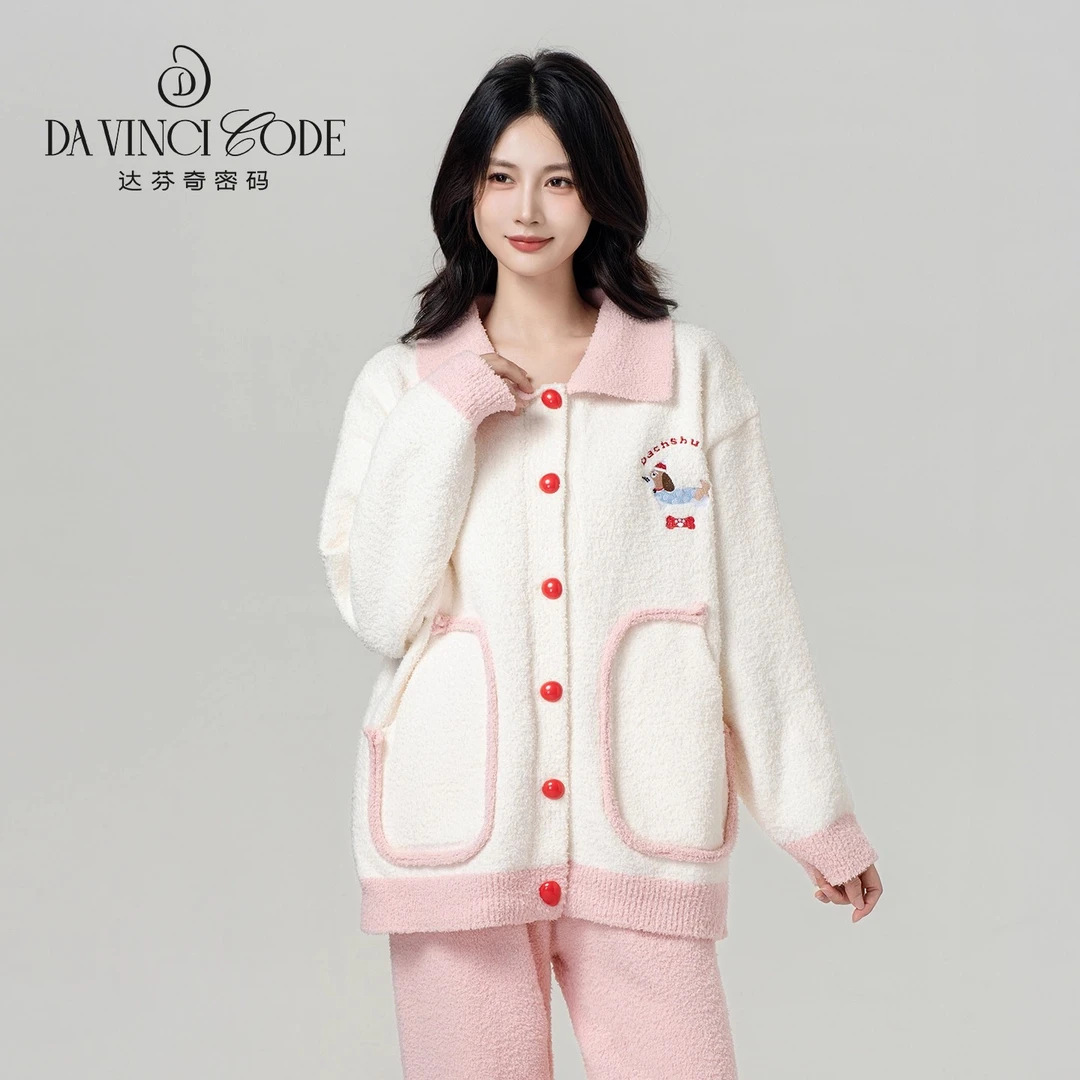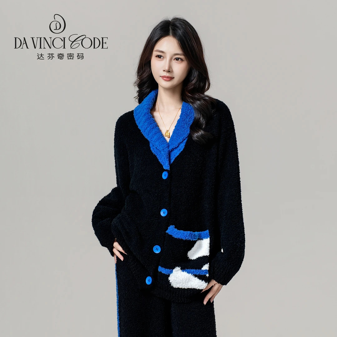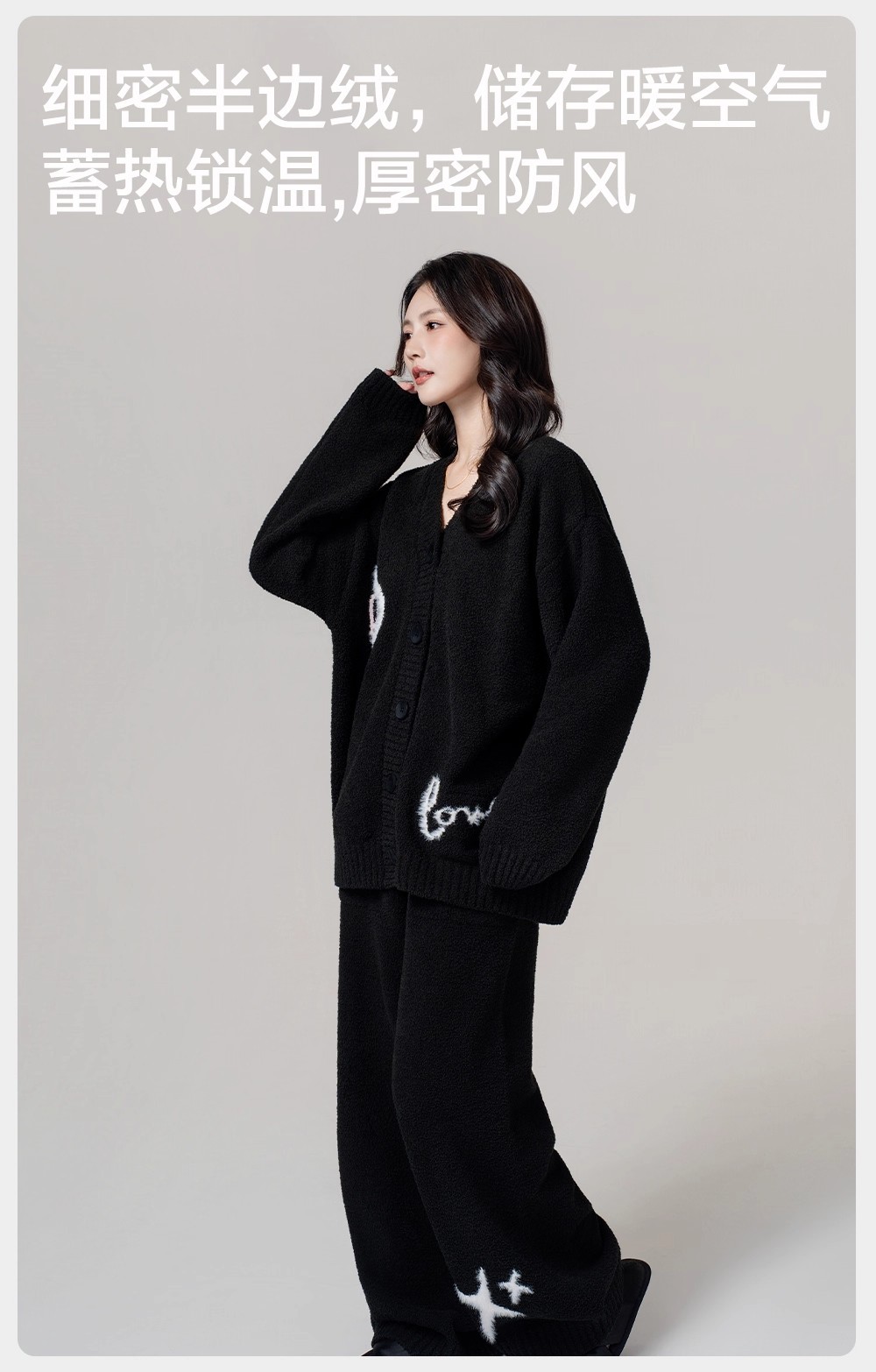 达芬奇密码秋冬新款睡衣女半边绒加厚针织毛衫粉黑开衫保暖家居服