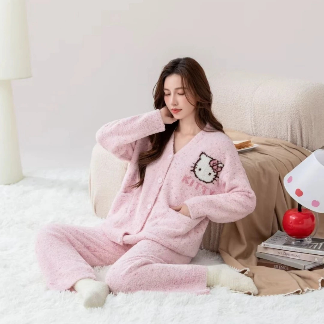达芬奇密码加厚保暖新款粉色KT睡衣女秋冬半边绒家居服休闲套装女