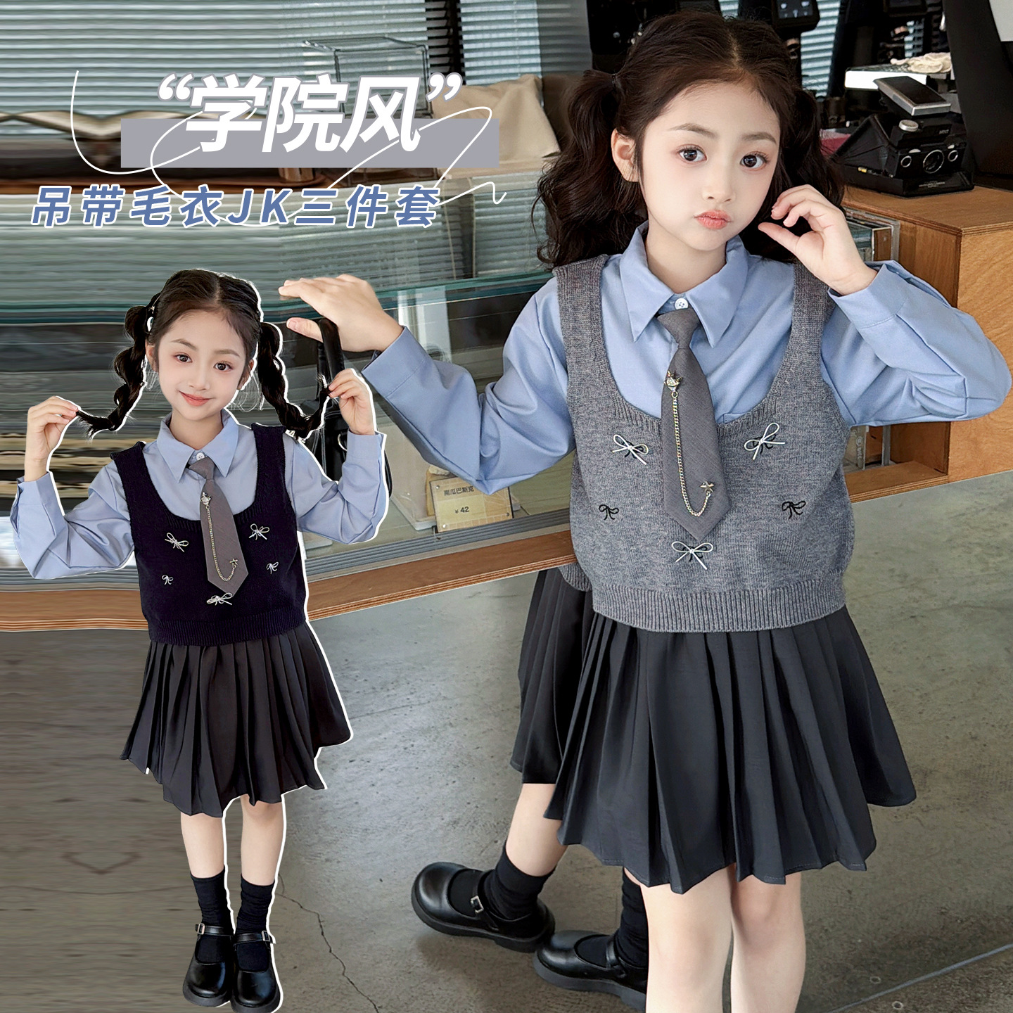 女童学院风套装2025秋季新款儿童时尚针织衬衫马甲百褶裙三件套