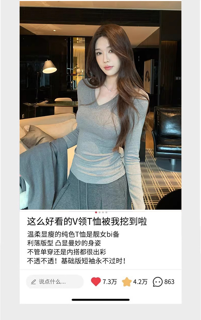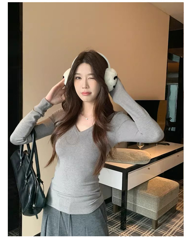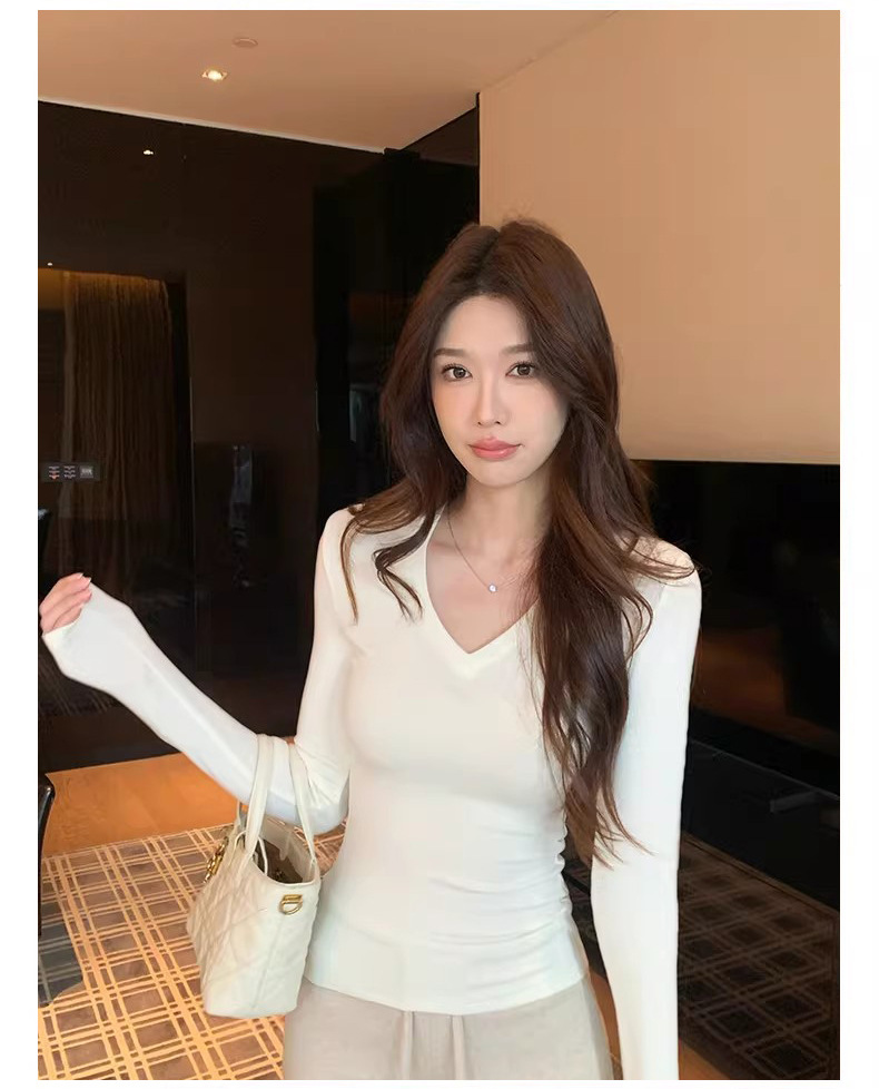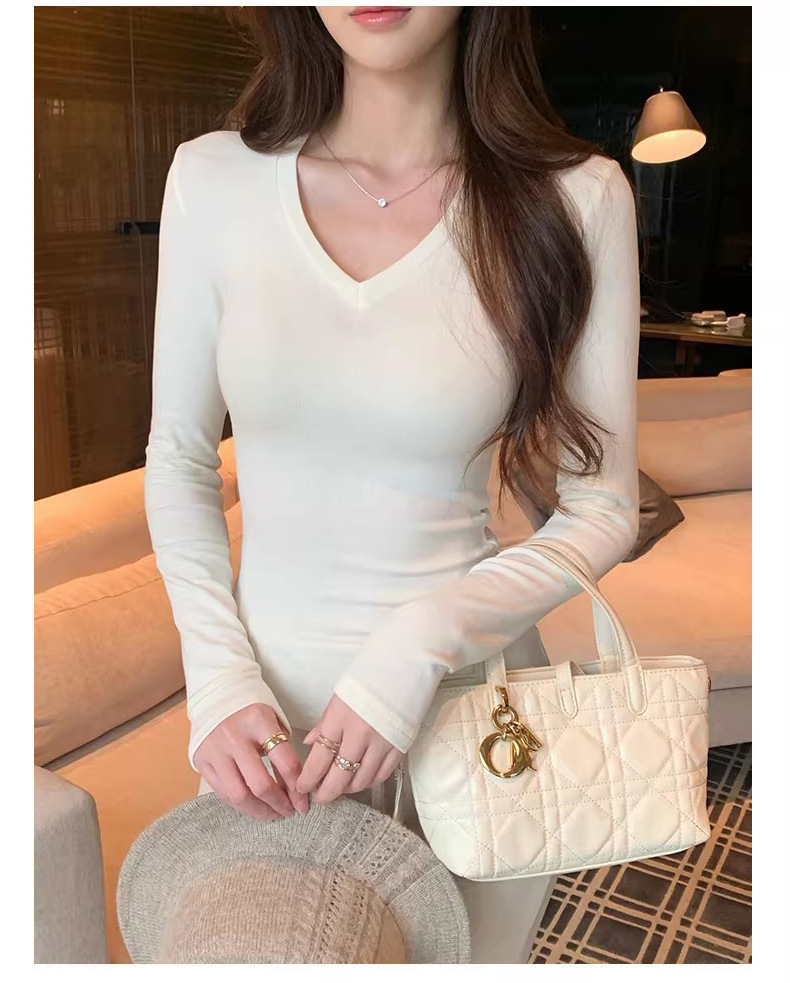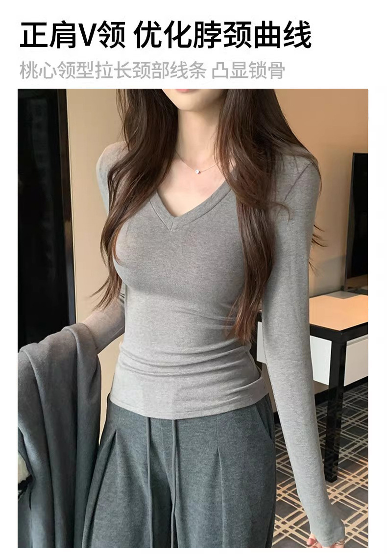 基础四色V领弹力紧身打底衫内搭女正肩T恤美式辣妹长袖上衣加绒