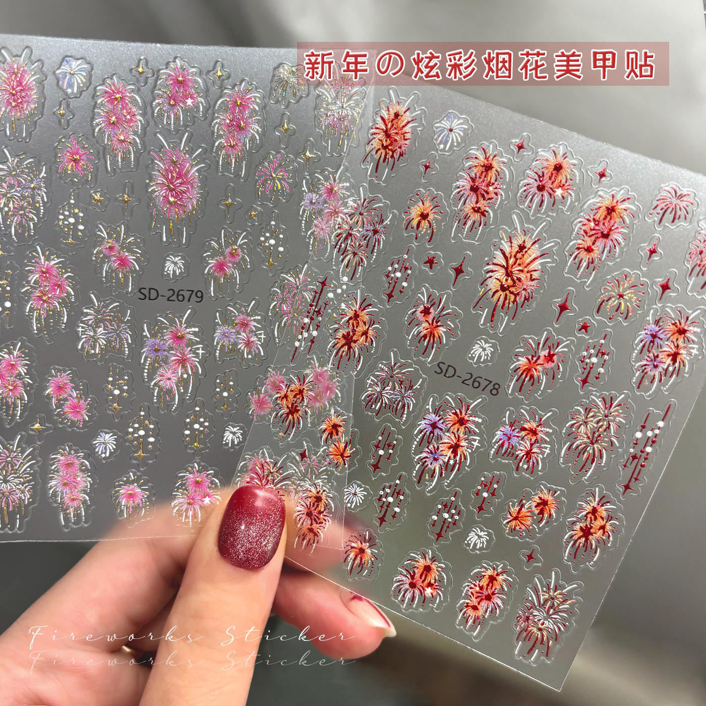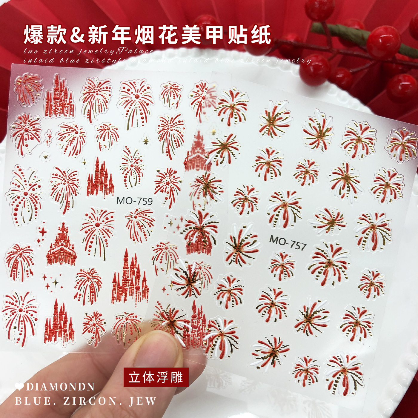 2026新年款烟花美甲贴纸浮雕立体红色烫金烟花指甲装饰品配饰批发