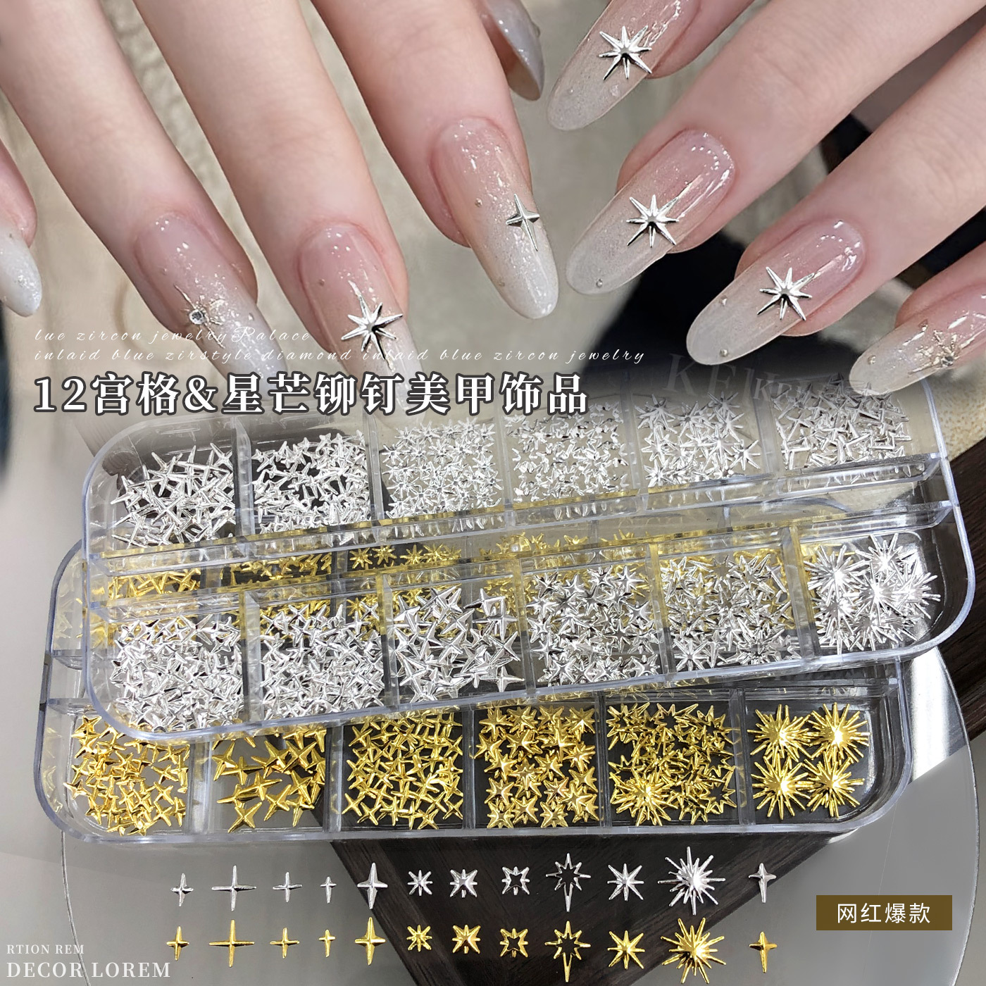 跨境爆款星芒美甲饰品12格套装金银色超薄十字架金属贴指甲钻装饰