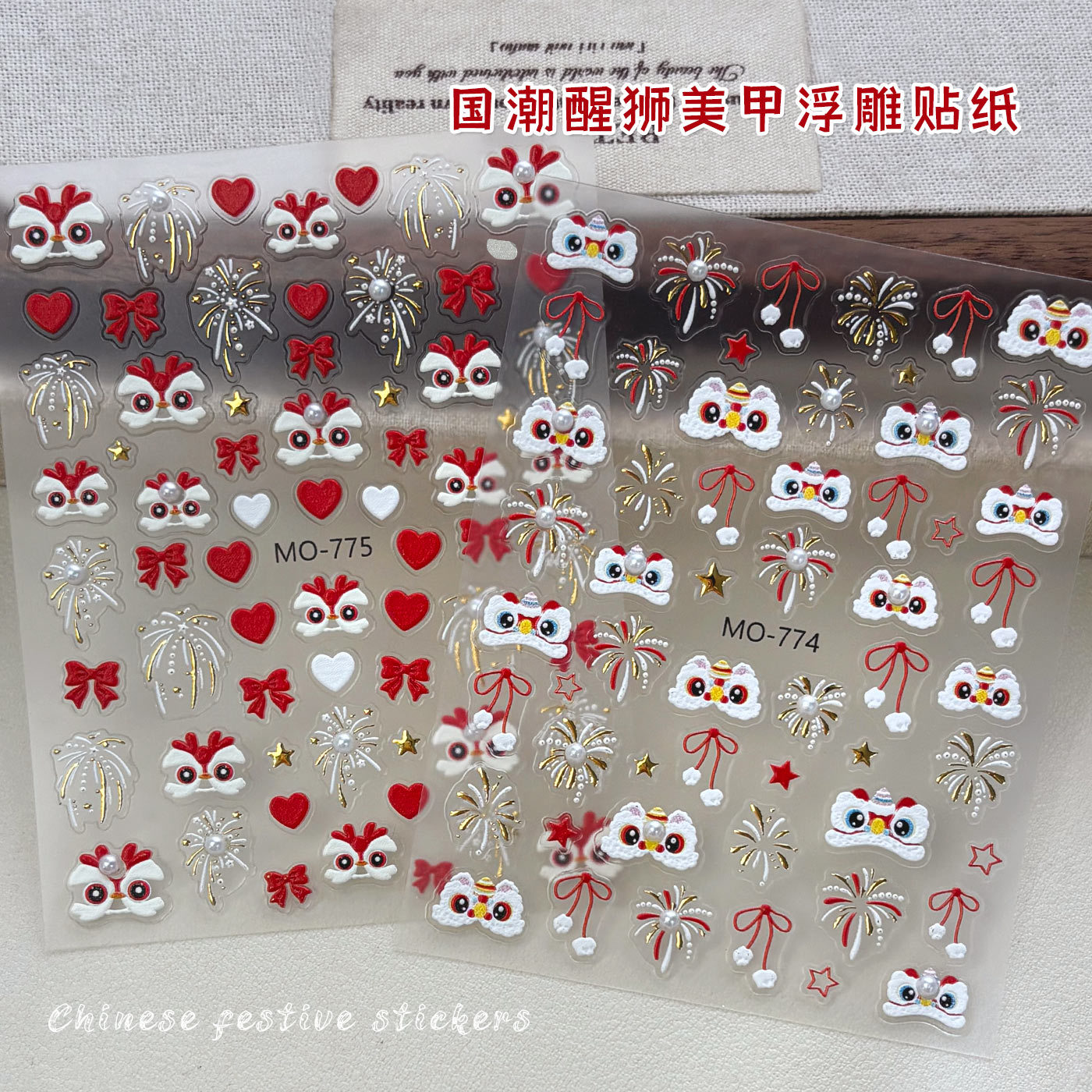 新年国潮醒狮美甲贴纸浮雕立体中国风烟花狮子头镶珍珠指甲贴配饰