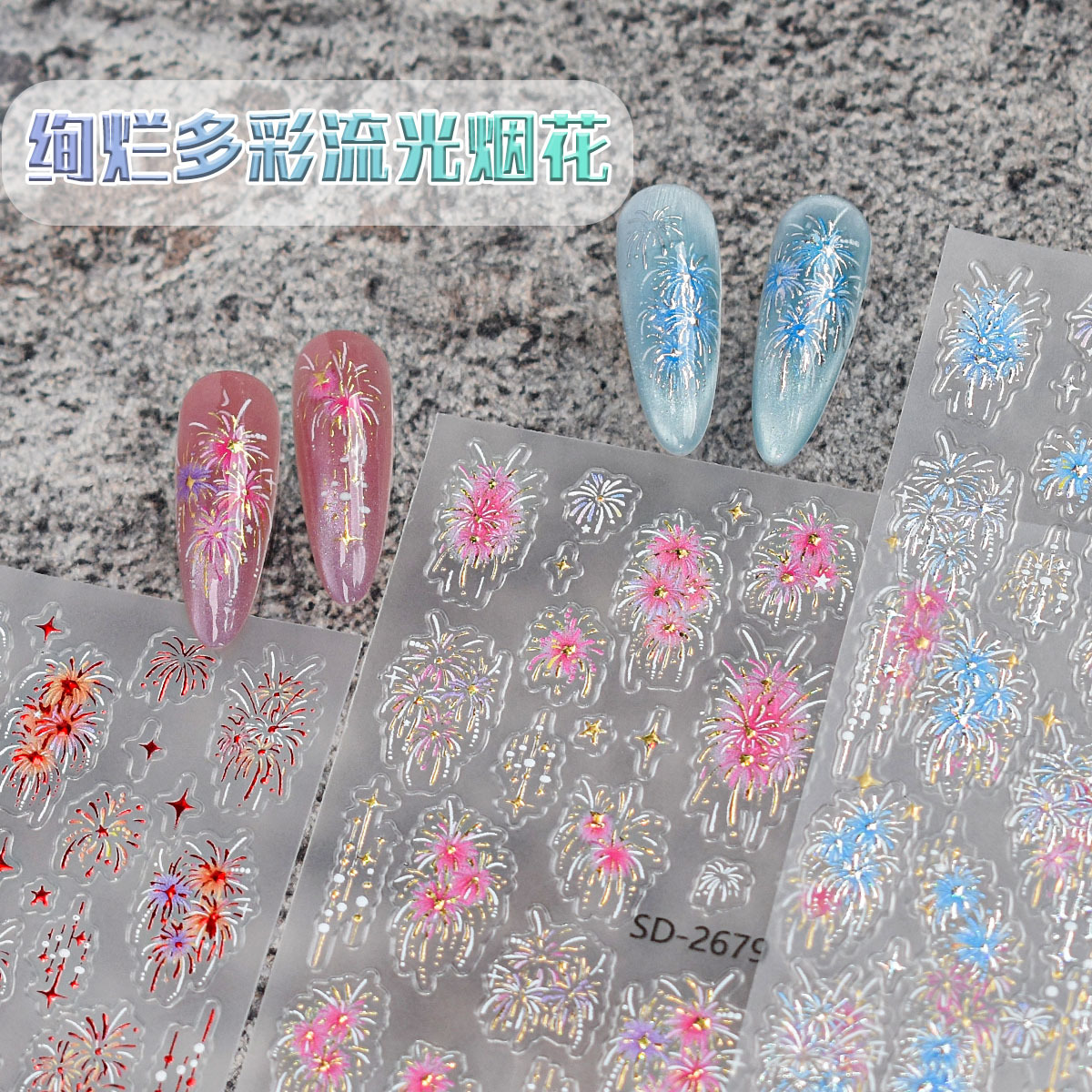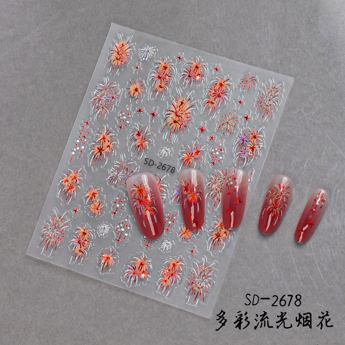 新年炫彩流光烟花美甲贴纸浮雕立体红色璀璨烟花指甲贴装饰品配饰