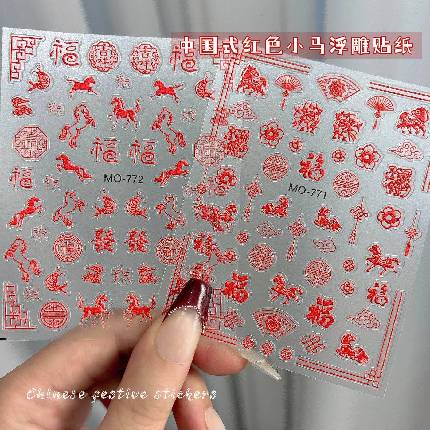 红色小马福字美甲贴纸2026新年浮雕立体喜庆中国结剪纸指甲贴配饰