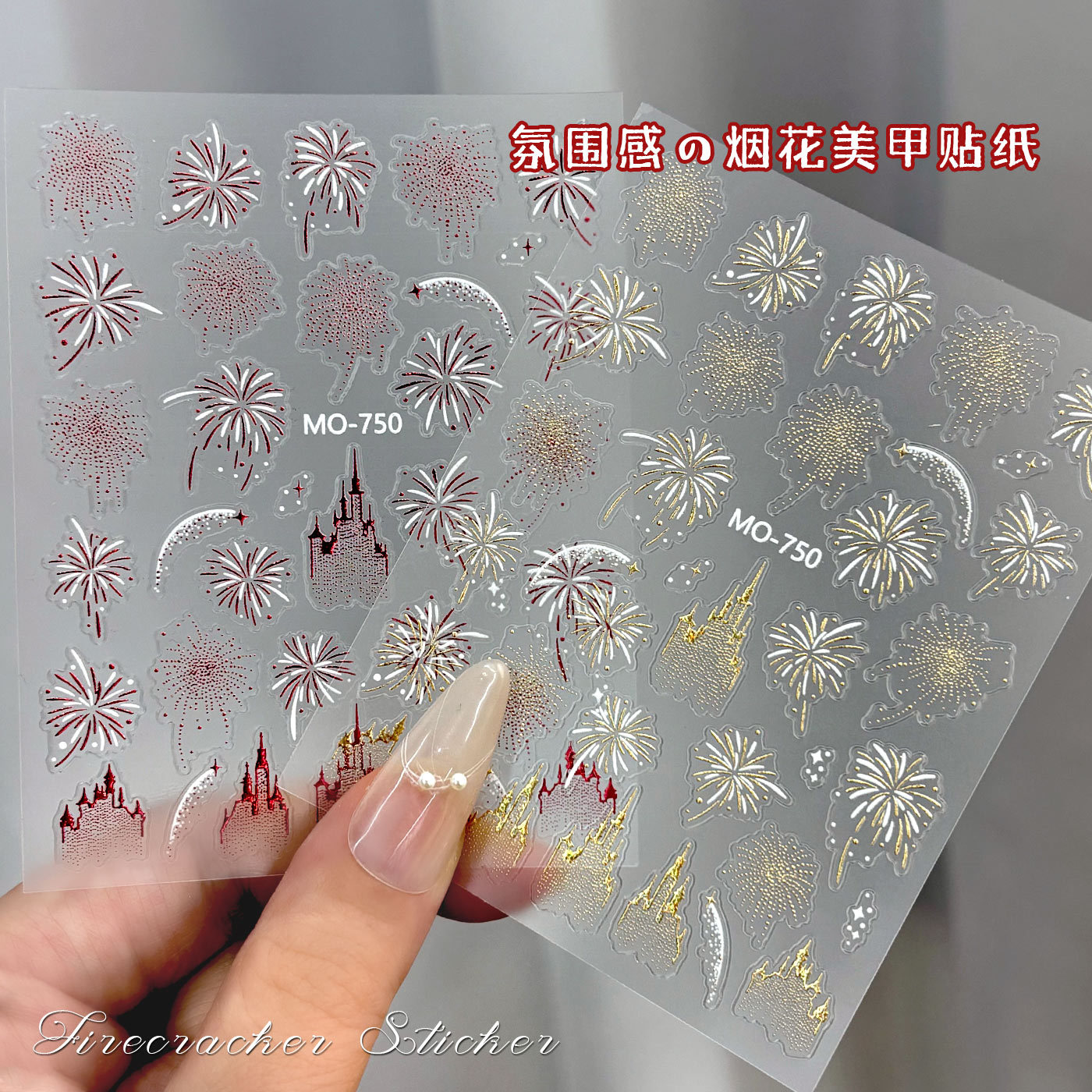 2026新年烟花美甲贴纸网红爆款梦幻城堡流金银红色璀璨烟花指甲贴