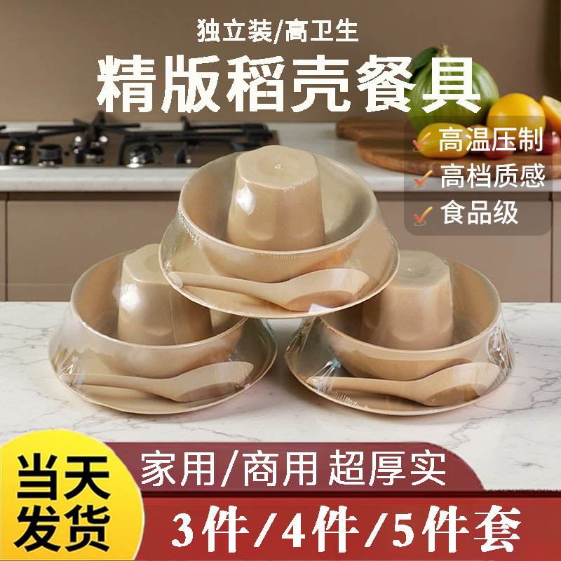 一次性稻壳餐具四件套酒席家用喜庆碗碟加厚碗筷杯盘碟勺套装商用