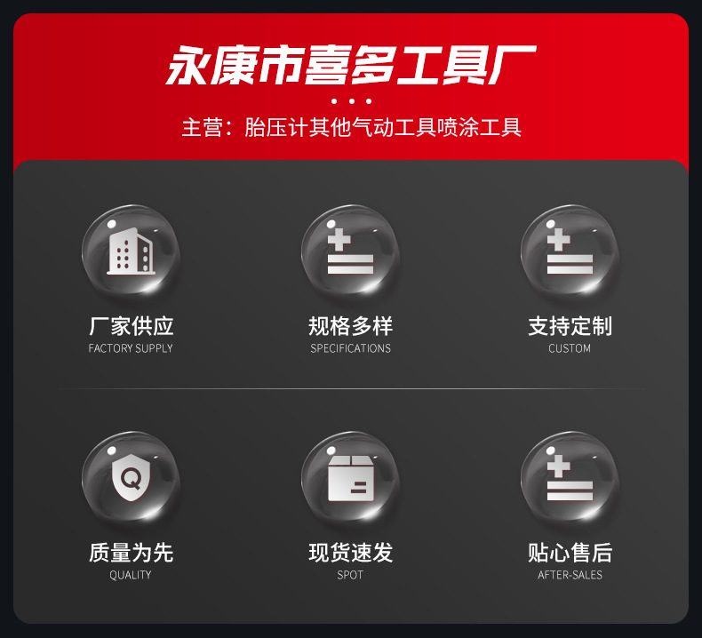 永康市喜多工具厂专业生产胎压计(笔),吹尘枪,胎压枪,清洗枪,喷枪,打气咀,快速接头,补胎工具等产品,本公司产品畅销全球,在消费者当中享有较高的地位,公司与多家零售商和代理商建立了长期稳定的合作关系。我公司产品品种齐全、价格合理。本公司实力雄厚,重信用、守合同、保证产品质量,以多品种经营特色和薄利多销的原则,赢得了广大客户的信任。