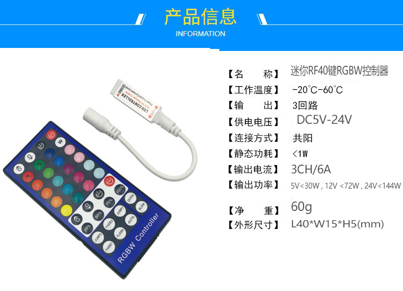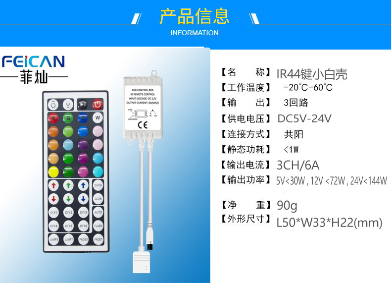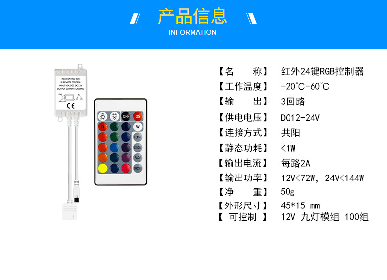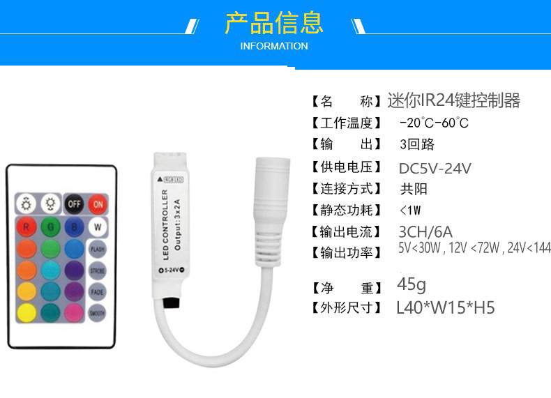 24键红外LED RGB控制器采用先进的微控制单元,用于控制各种LED光源的灯具。例如,点光源、柔性灯带、洗墙灯、玻璃幕墙灯等;同时,它具有连接方便、操作简单等优点。根据客户的实际需求,它可以实现跳跃式变化、渐变和其他变化效果。共有24种模式供您选择。