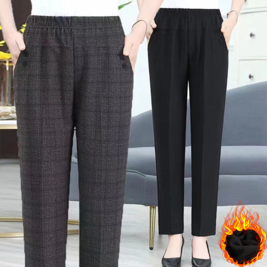 秋冬季新款中老年麻料加绒休闲裤女士厚款大码裤子妈妈女高腰长裤
