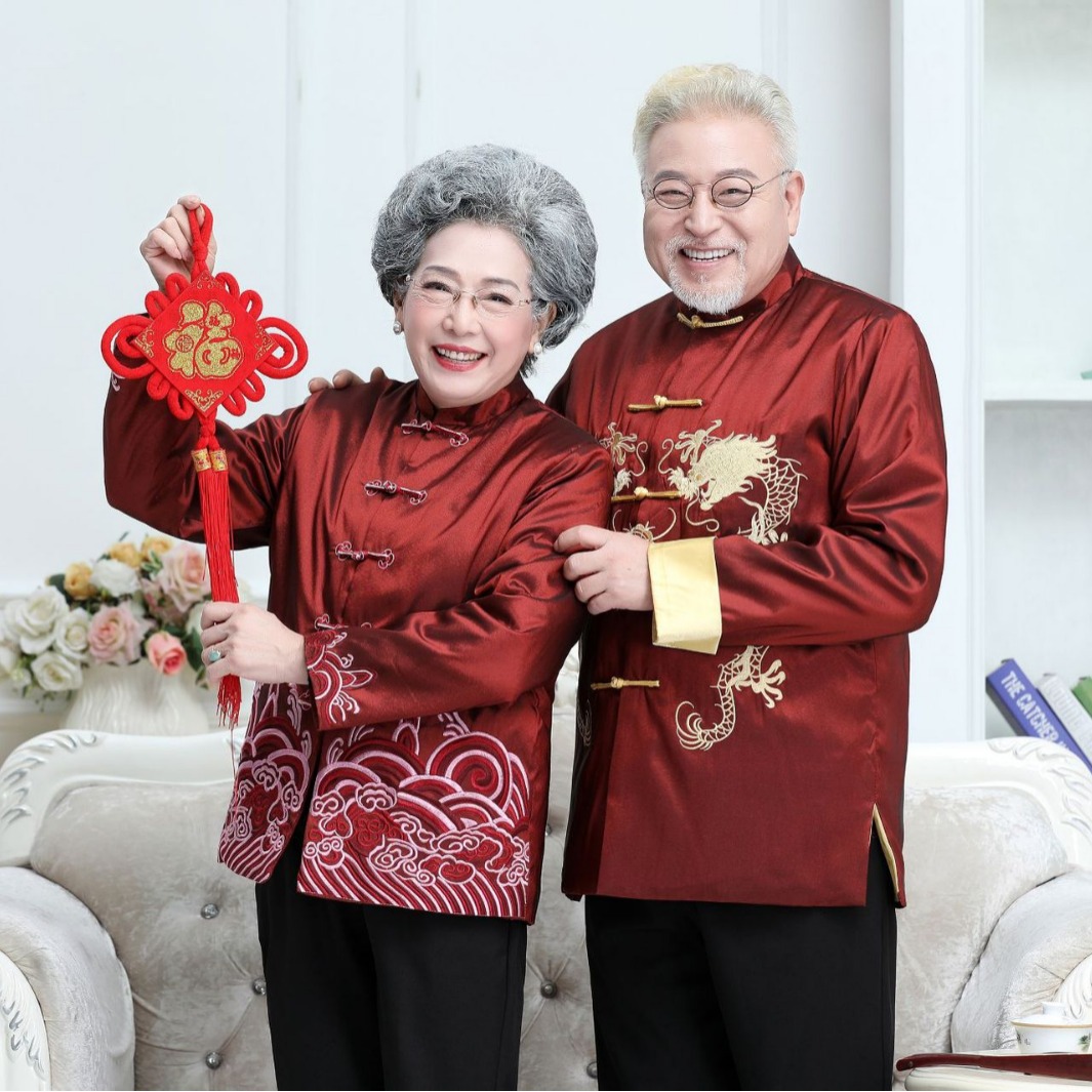 秋装中高年2383-6カップル唐装男女長袖誕生日過寿中国式ドレス老人薄手コート