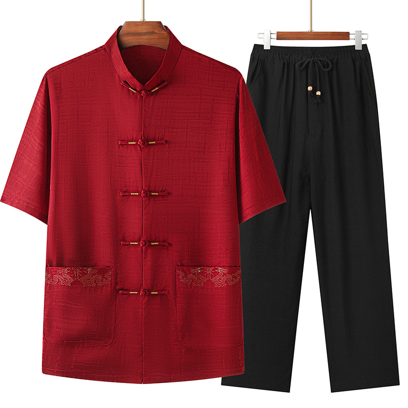 3223お父さん夏服40歳50中高年半袖長袖唐服セットおじいちゃん夏中国風メンズ