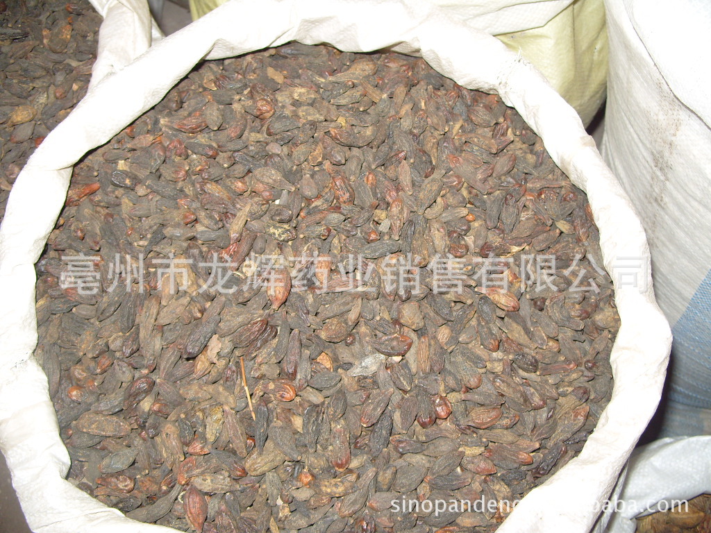 【性状】 本品呈纺锤形,两端钝尖,长2.5~4cm,直径1~1.5cm。表面棕黄色或黑褐色,有不规则皱纹。果肉灰棕色或棕褐色,质硬。果核梭形,暗红棕色,具纵棱;内分3 室,各有种子1 粒。无臭,果肉味涩,久嚼微甜。