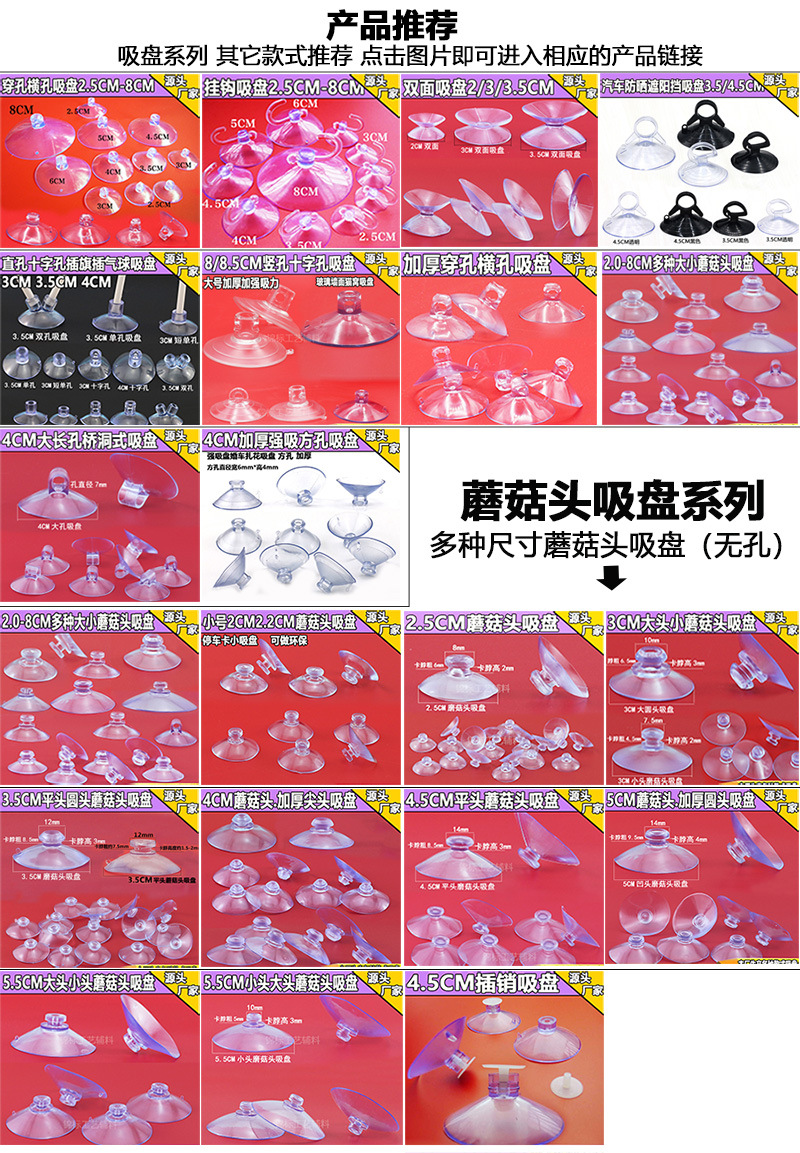 我厂是专业的玩具吸盘、挂钩,PVC吸盘,环保吸盘,直径从15MM-80MM,同时还有吸盘挂钩及透明PVC脚垫。吸盘吸附力强,有PVC、SBS、SEBS等,可达到环保无毒。价格低廉,不用打钉粘胶,吸附面不会有任何损伤,广泛适用于电子、玩具、手袋、工艺礼品、广告促销品、家居用品、汽车装饰等领域。