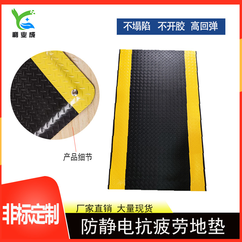 地垫表面选用防静电pvc(橡胶导静电),带有黄色静电警示带(客户要求还可以舔加静电敏感符号),外观醒目,美观;中间层为EPDM海绵,脚感舒适。各层用环保型强力粘占剂牢固贴合。