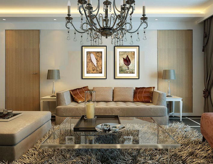 リビングルームの装飾画ソファーの背景の壁はヨーロッパ式の3連画を描いています。