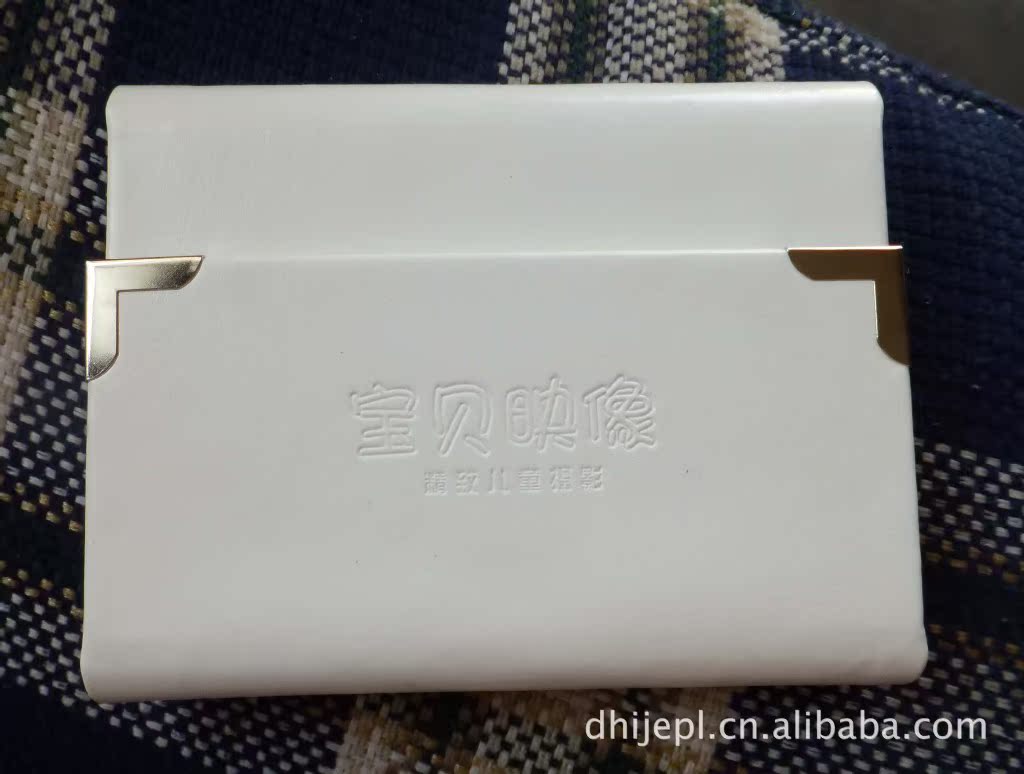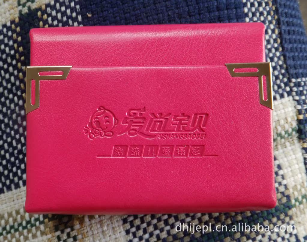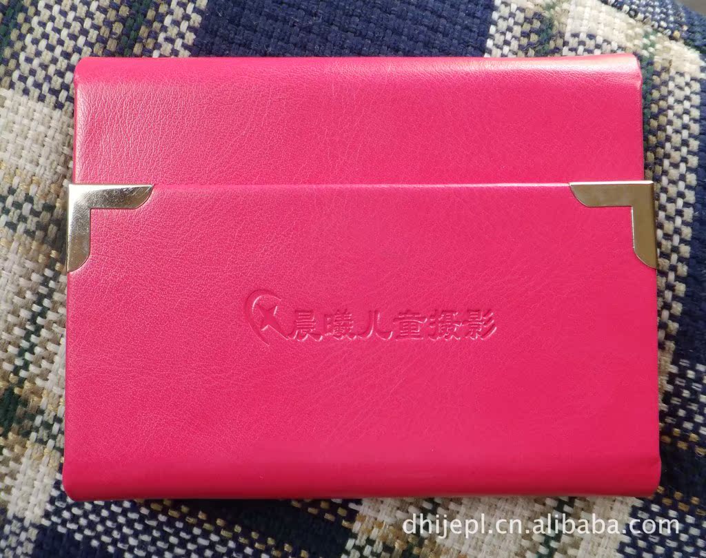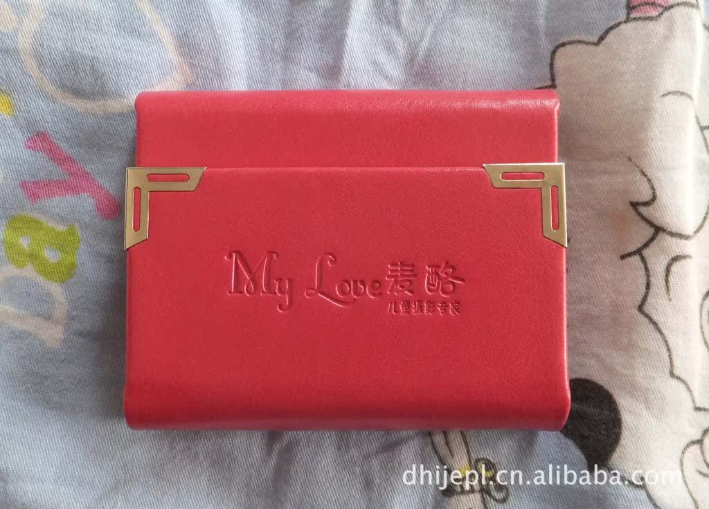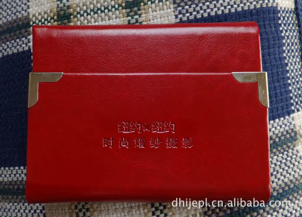 此款为钱包式相册,高档皮面料,不锈钢护角。皮料颜色有白、棕、枣红、桃红(粉)、深蓝 麻布面绿 麻布面蓝7种(如下图示 会有色差)。标准品在封面上印一行韩文,内页标配为折叠式内页(也称风琴内页或屏风式内页),有带胶和不带胶可选。带胶者撕下保护纸即可粘贴照片,操作工艺简单,方便快捷。可入11张照片。可搭配翻页式内页,有多种翻页式可选,价格不同,请与买家联系。