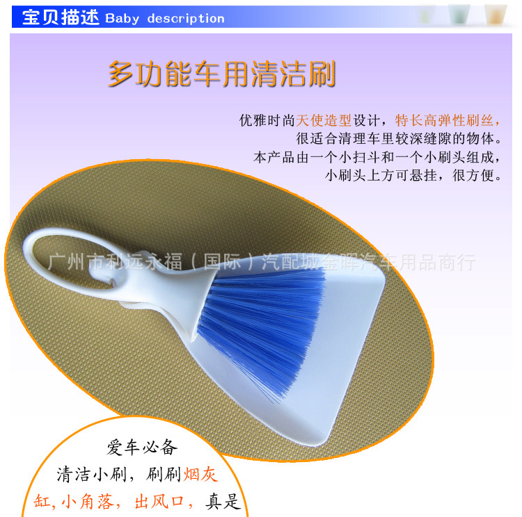 汽车多用刷优雅时尚天使造型设计,特长高弹性刷丝,很适合清理车里较深缝隙的物体本产品由一个小扫帚和一个小刷斗组成,小扫帚的上方可悬挂,很方便。
