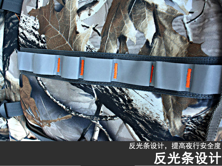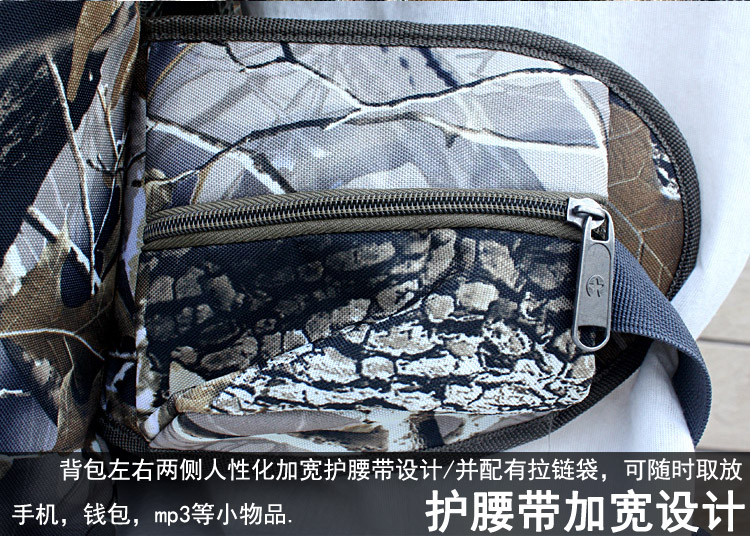 特点:厚实耐磨的大自然衍生迷彩面料制作;两根强有力的铝合金支架能增加承重能力;贴心的15.6寸电脑内胆设计,让你在户外不再孤单;腰带上有专门的求生哨设计,可以在野外迷路时可以及时发出求救信息。