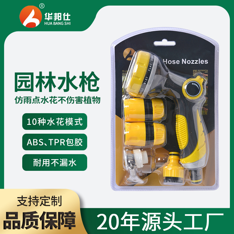 喷枪为手握弹力式设计,用手一握即可喷水 ,松开即可停水,调节枪头即可喷出线状锐利喷射形、锥状水伞形、雾状喷灌形等多种形式的水流、以满足各种不同个性化的冲洗浇灌需求.除了用来专业洗小车,还可以用来洗摩托车 为花草树木浇水 还可以清洗卫生间、厨房、阳台、过道,地毯等;经久耐用,是长期使用的选择。
