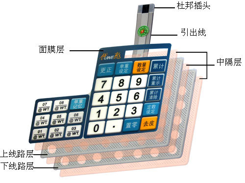通常最上层是由PET或PC材料组成的有文字或图案印刷有面板,下面是可导电的印刷线路,