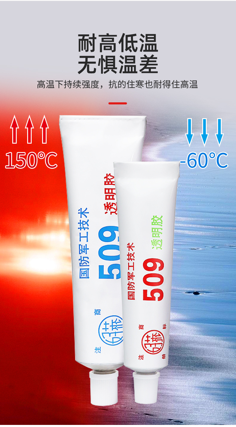 509透明胶粘剂以晶莹、固化快、粘接力强为主要特点,具有耐水、耐油、耐沸水煮、耐曝晒、既能耐酸碱又可防腐。并能耐低温零下60度,耐高温90-130度,速走耐温180-220度。同时,胶内可调配各种色彩粉。可作密封电绝缘层,可在拼木地板、广告牌、照牌面子、家具面上、水泥地坪面上喷涂照光用。