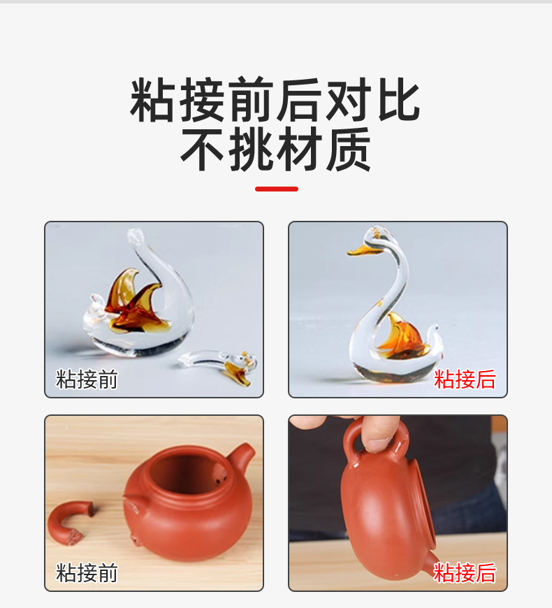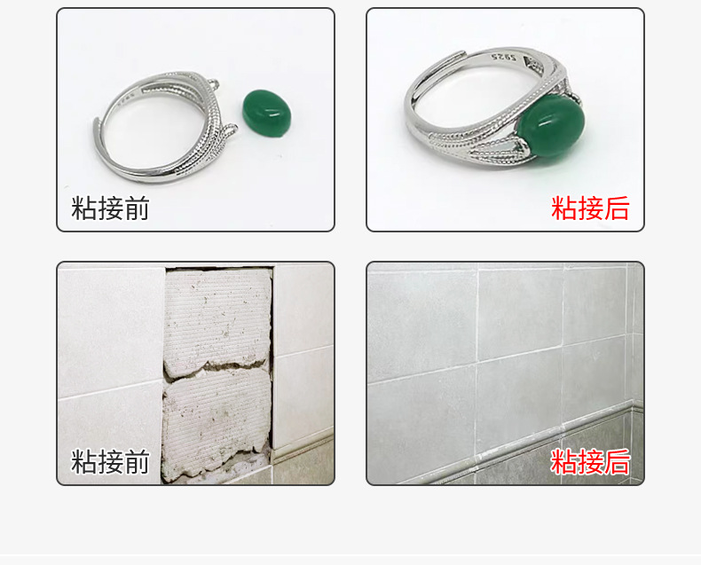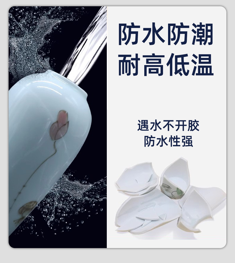 可粘接玻璃、陶瓷、大理石、花岗石、瓷砖、胶木、塑料、各种金属、橡胶、竹木、工艺品、骨板、水泥制品、织物布类。又可修补汽车、机械、水箱、油箱、化工管道裂漏、阀门、水管、水龙头、防空地下室等,具有较好的密封程度,同时还可作电器灌封用。