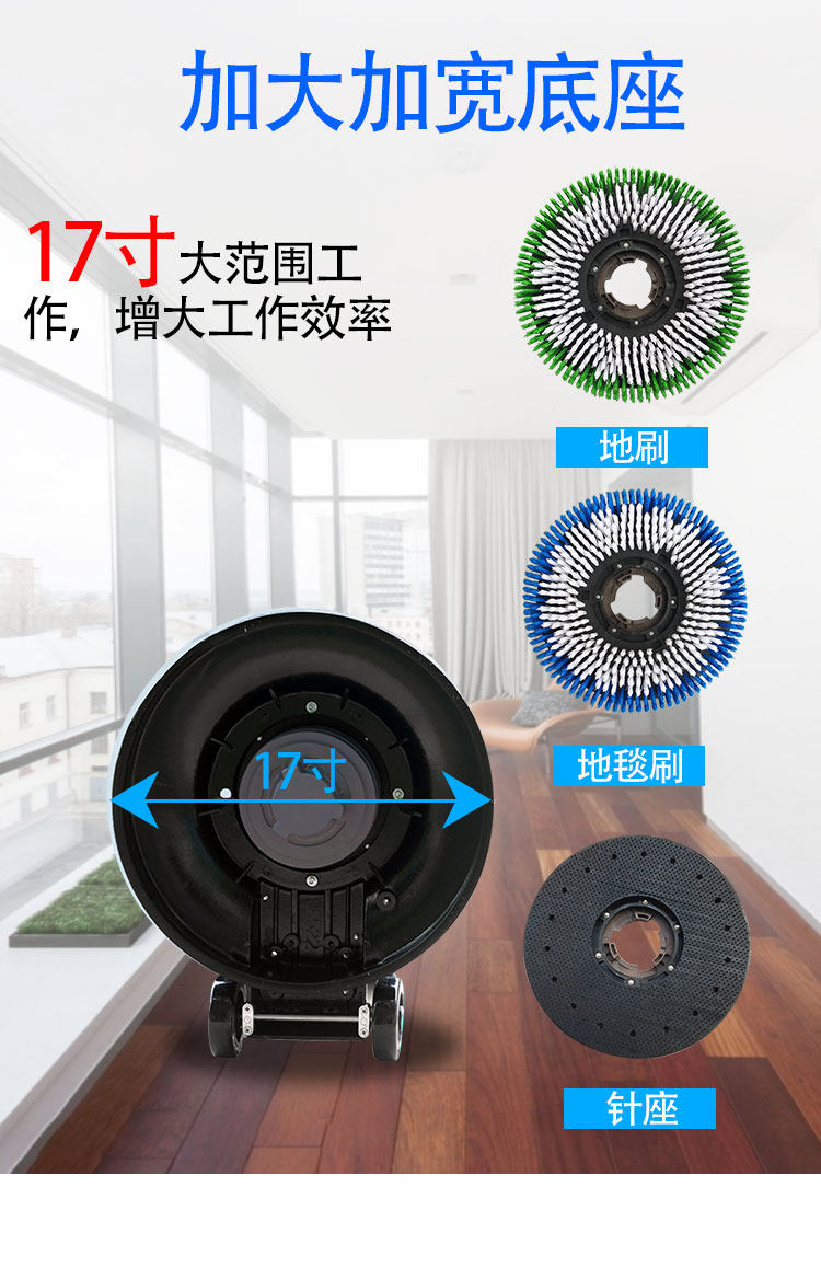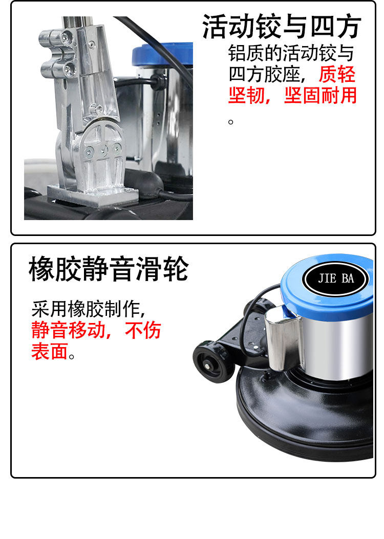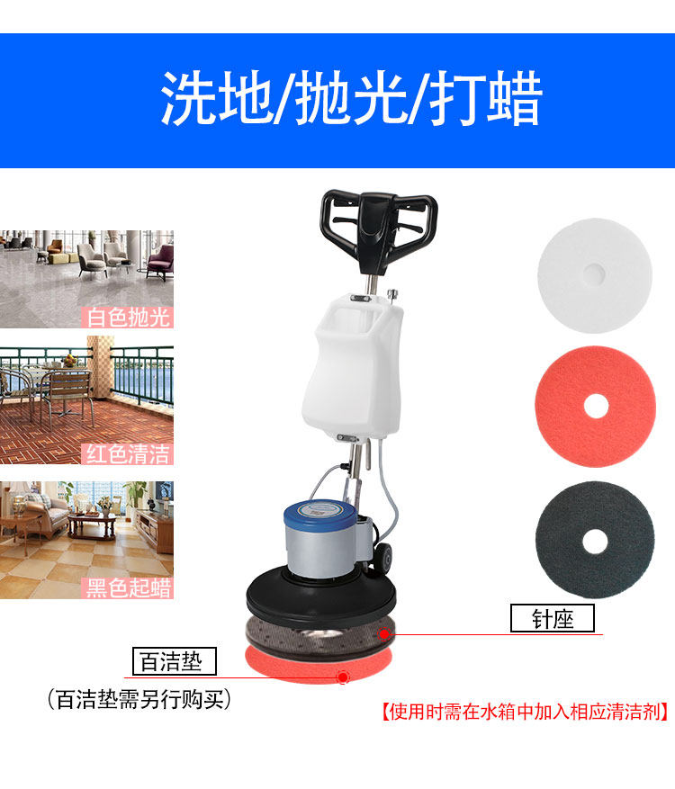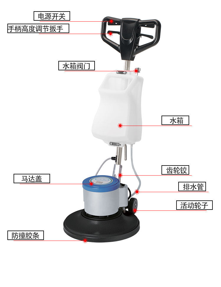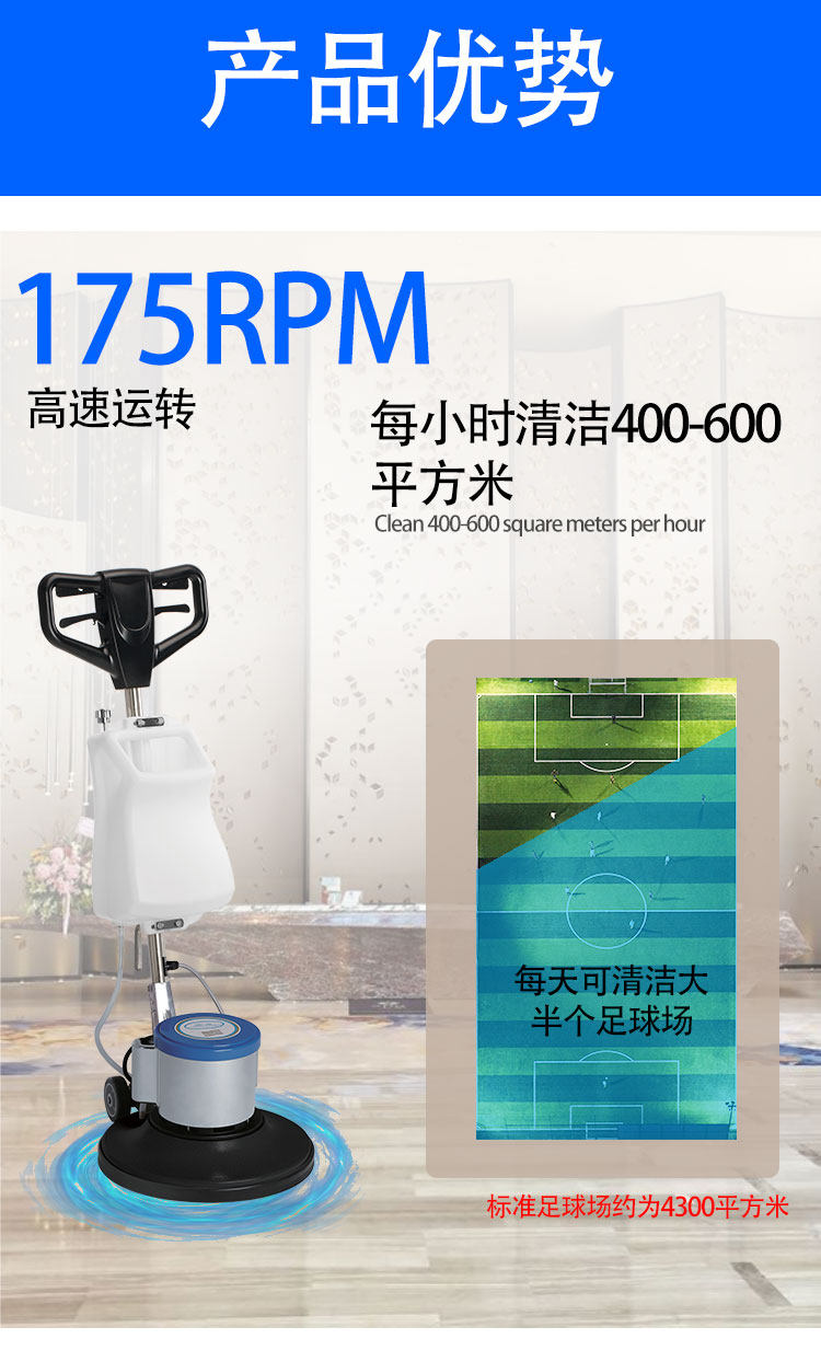 产品性能优点:采用原厂电机,整机塑料均用优质塑料制造而成.坚固耐磨,手控式设计令你工作轻松简单.同时具备四大功能:洗地、洗地毯、起蜡、磨光.满足各种场所及各种需求人群.