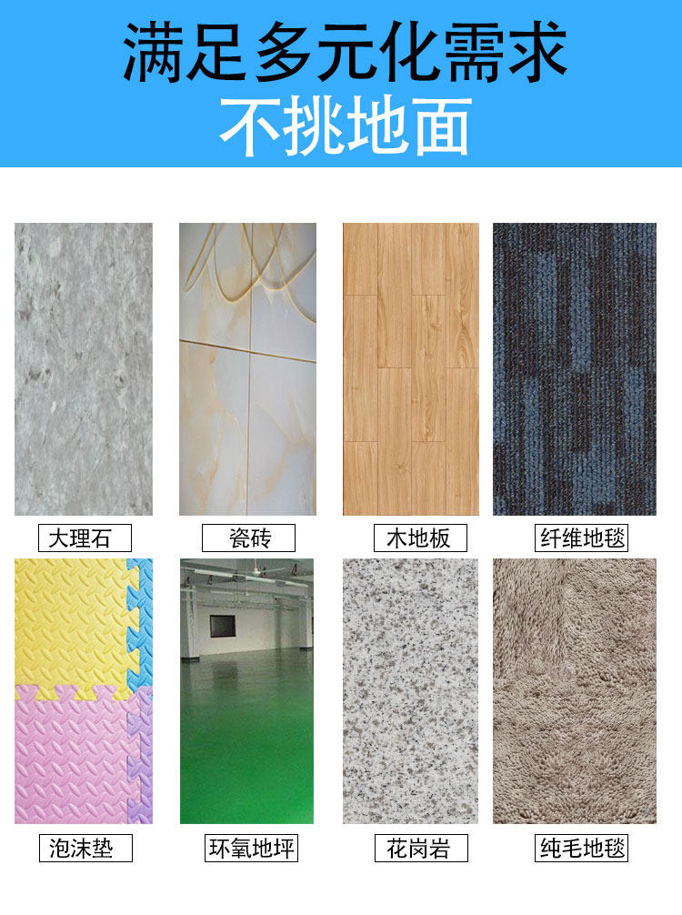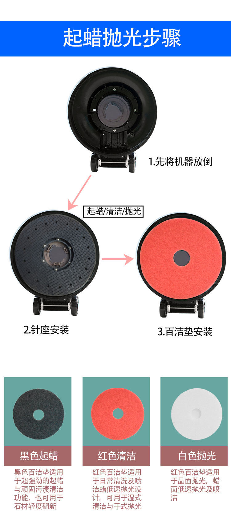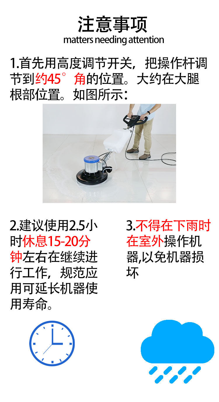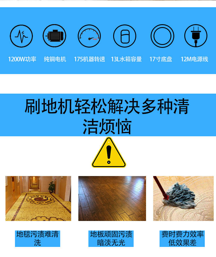 产品性能优点:采用原厂电机,整机塑料均用优质塑料制造而成.坚固耐磨,手控式设计令你工作轻松简单.同时具备四大功能:洗地、洗地毯、起蜡、磨光.满足各种场所及各种需求人群.