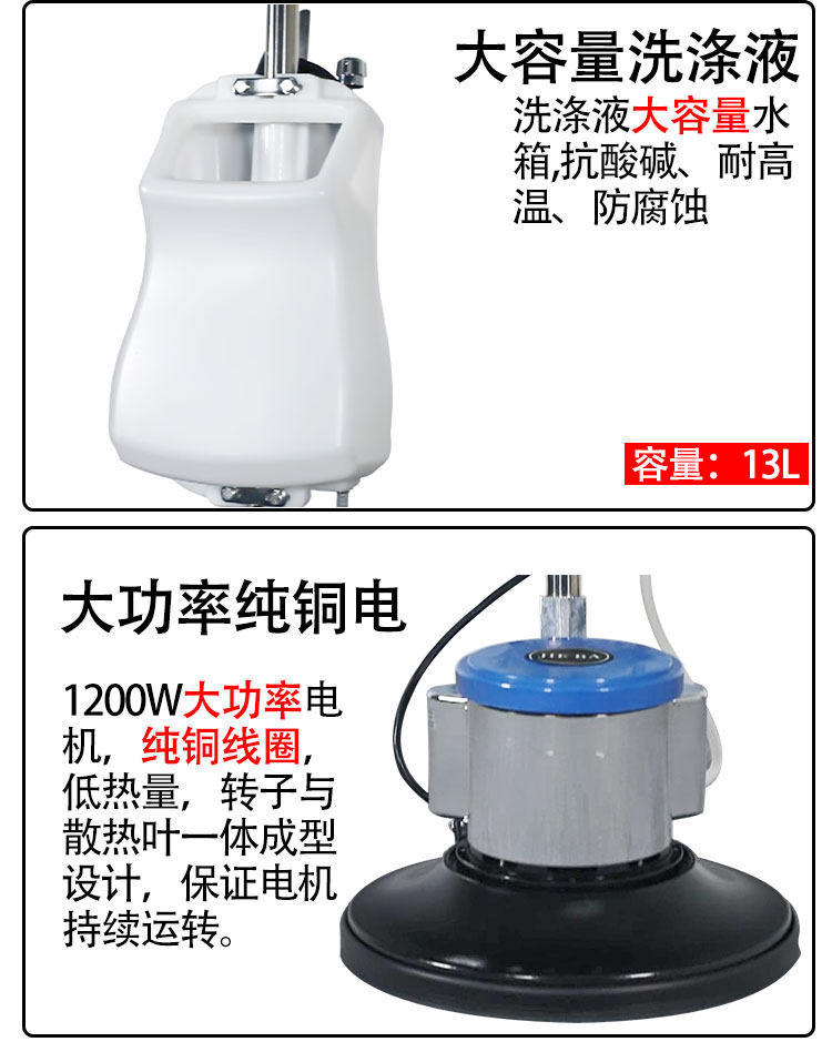 设计特性:利用齿轮传动,精密零件设计,启动电容和起动电容双配置,动力强劲,安全可靠.为你的工作提高效率和质量.13升容量水箱可装清水或清洁剂.在洗地和洗地毯时放些清洁剂能提高效率和工作的质量.宽大的底盘附防撞胶圈,机身稳重,动力强劲,安全可靠.多年来已得了广大用户认可,在宾馆,酒店,工厂等清洁场合都得到了广泛应用