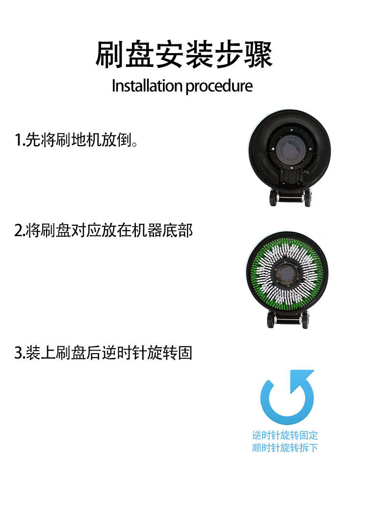 8、严禁将刷地机当成其他清洁没备使用,特别不允许在刷地机上额外增加重量,或让人站在刷地机上进行操作,否则不仅易使操作者受伤,而且会增大刷地机的负荷,严重时会烧毁电机或损坏行星减速器的齿轮。