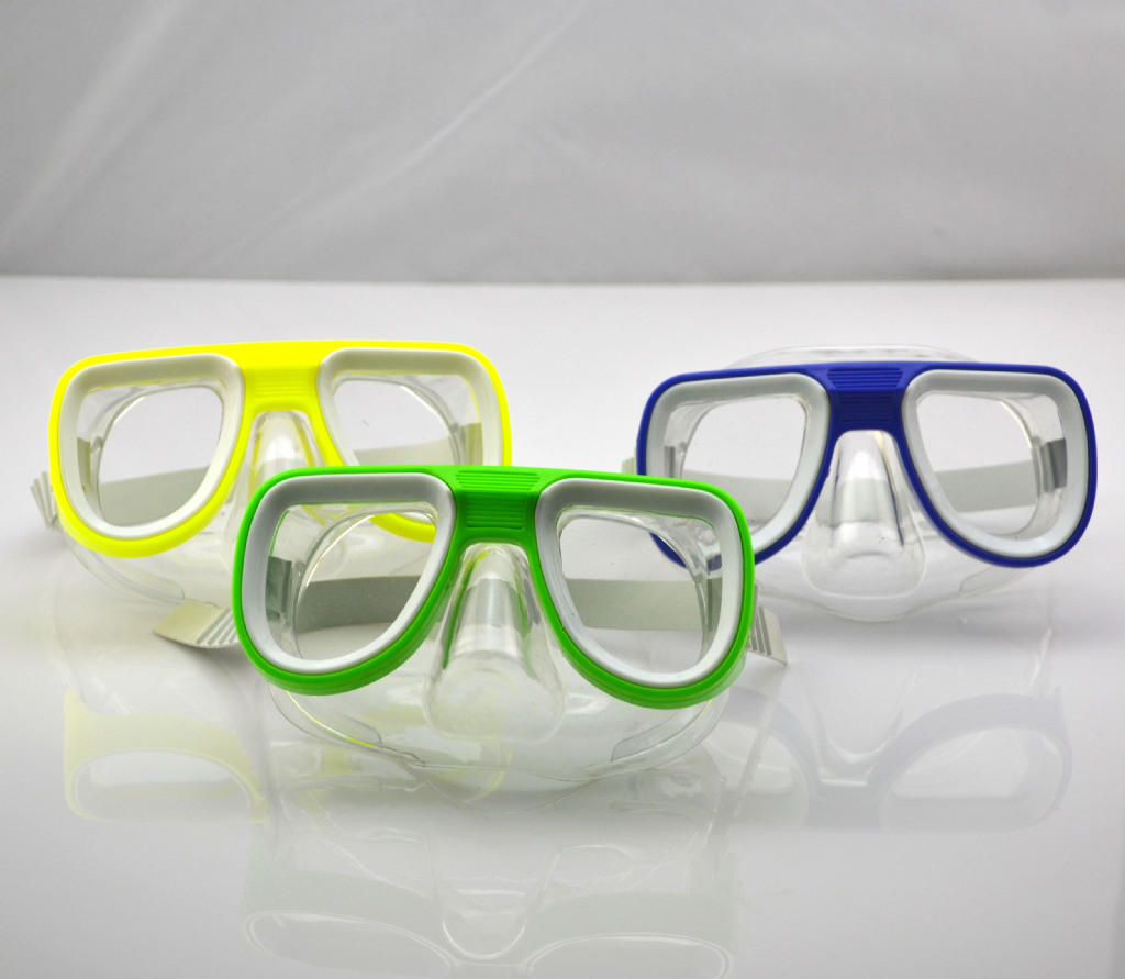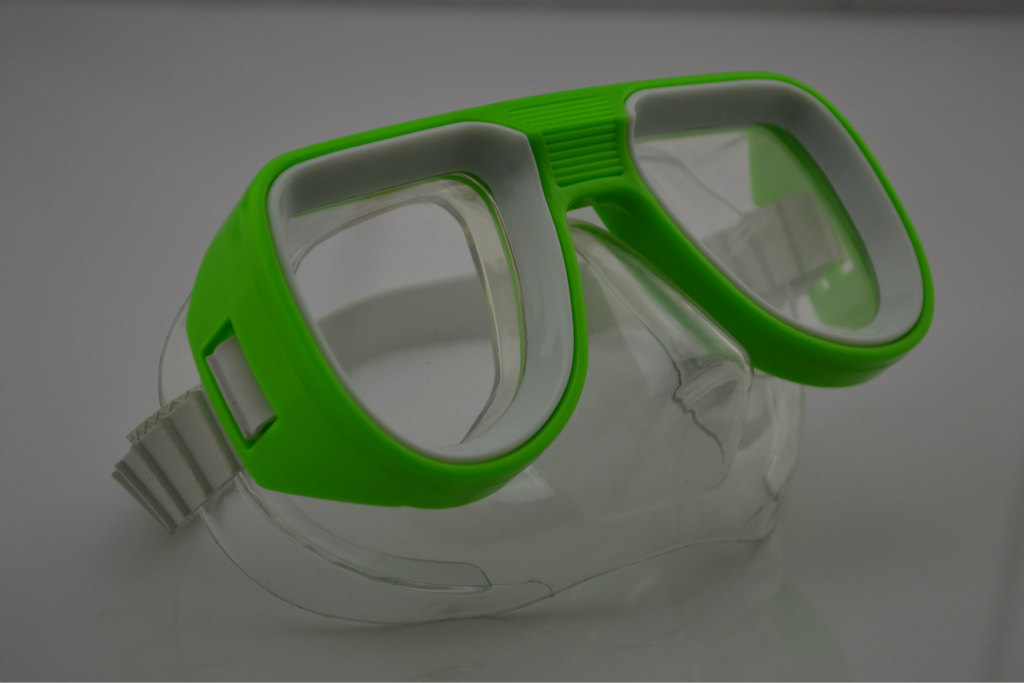 镜片为明苯材料,镜圈为ABS材料,面罩PVC材料、头带为橡胶材料三色混装