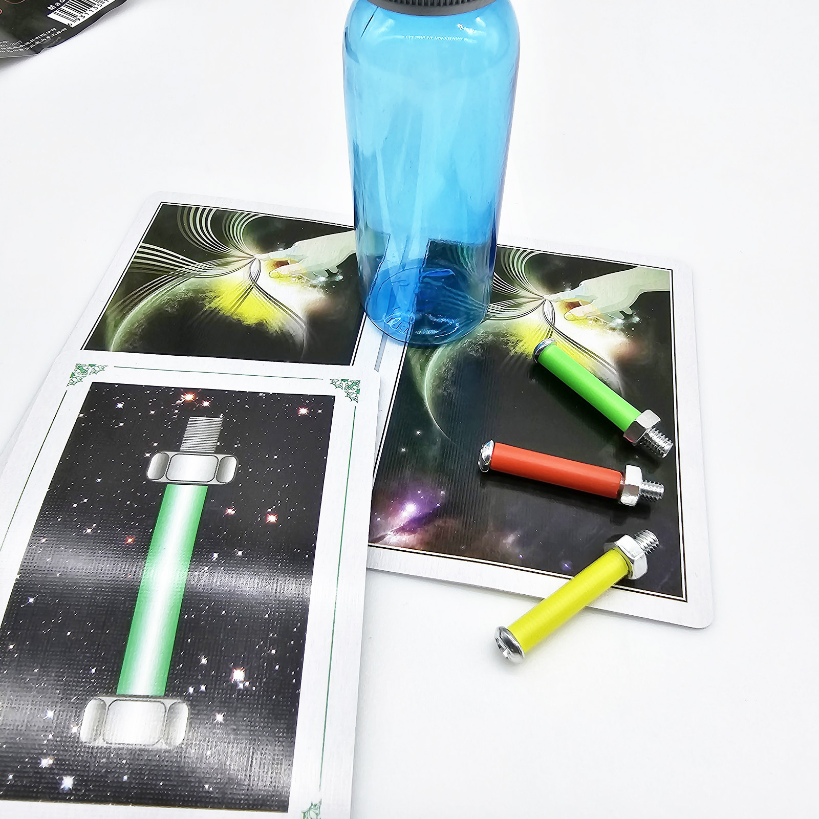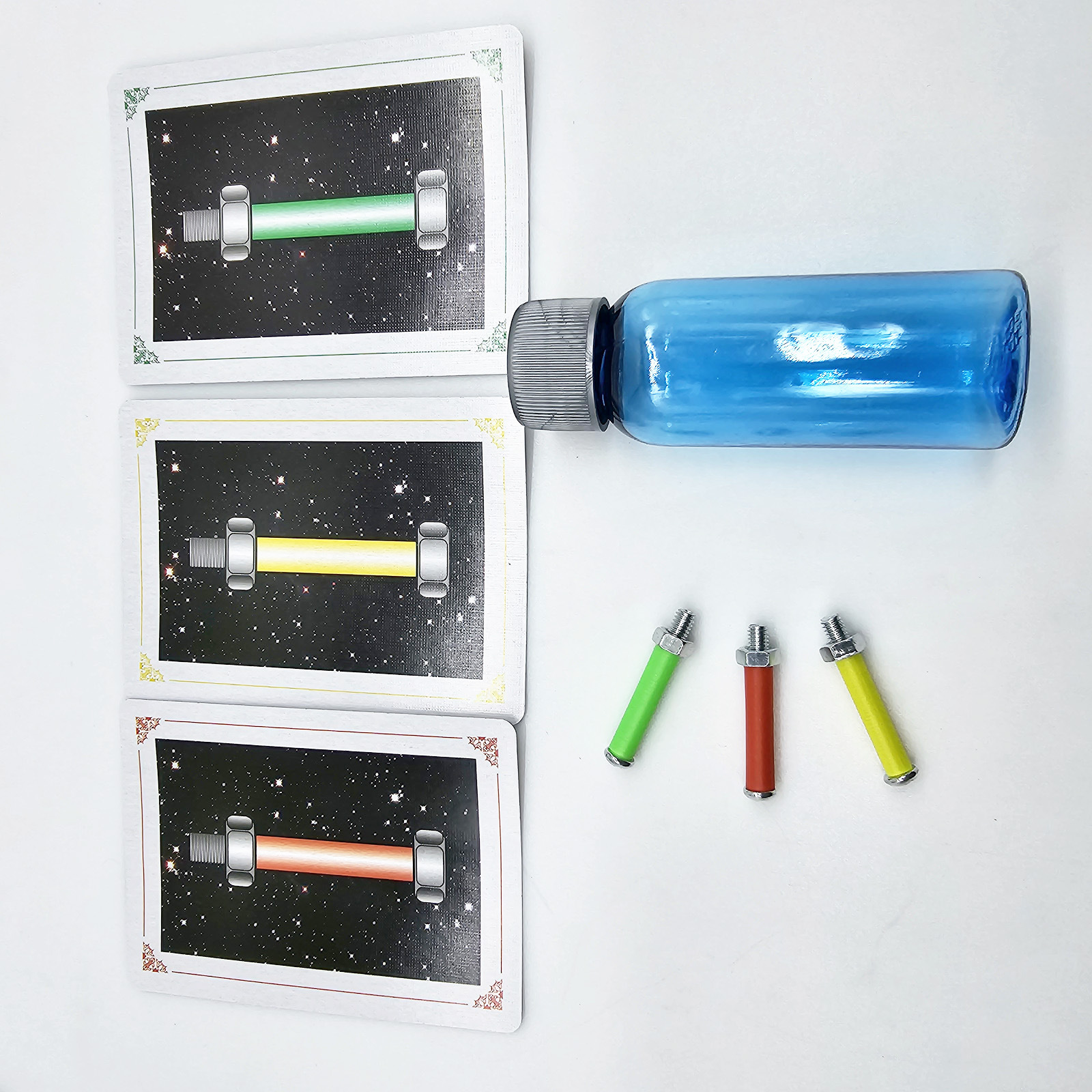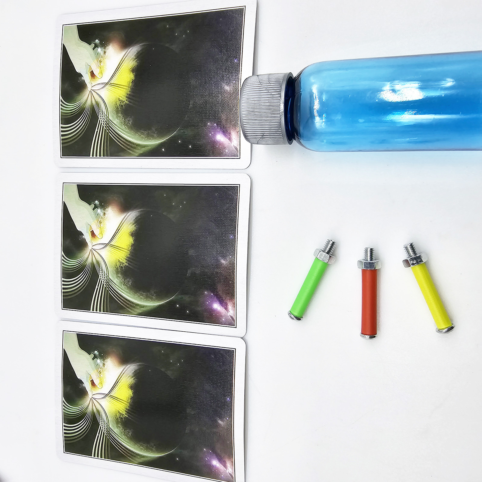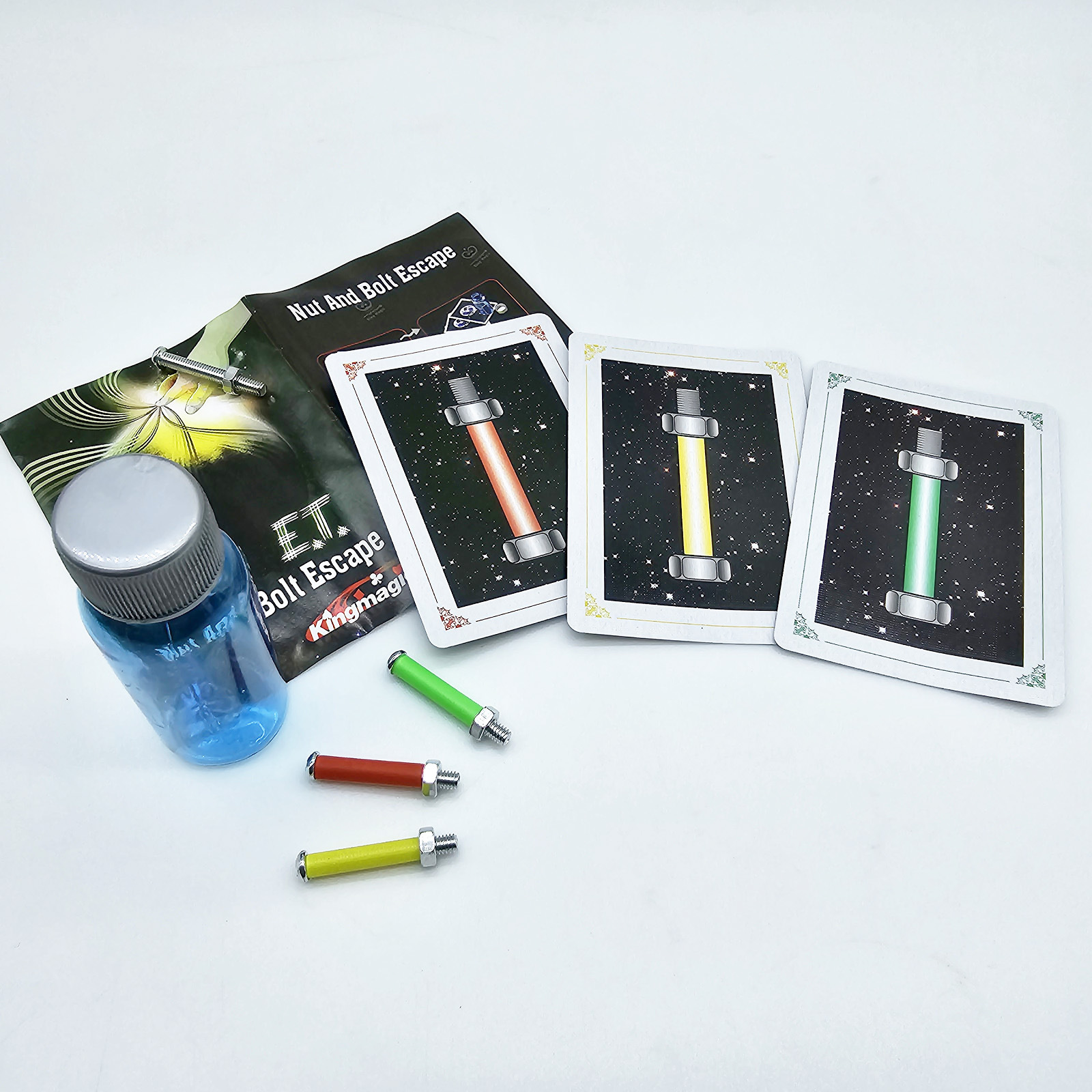 表演者先在看不到扑克牌上图案的情况下让观众任意选择一张扑克,然后把三个带有螺丝的螺母放到一个小瓶里,摇晃几下,就会有一种颜色螺丝和螺母自动分开了,而其它两个没有分开,这时候观众打开自己所选择的那张牌,竟然自己选择的扑克上的图案和自动分开的镙丝的镙母的颜色一模一样。