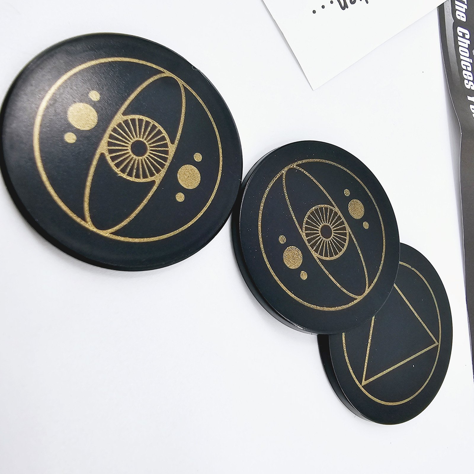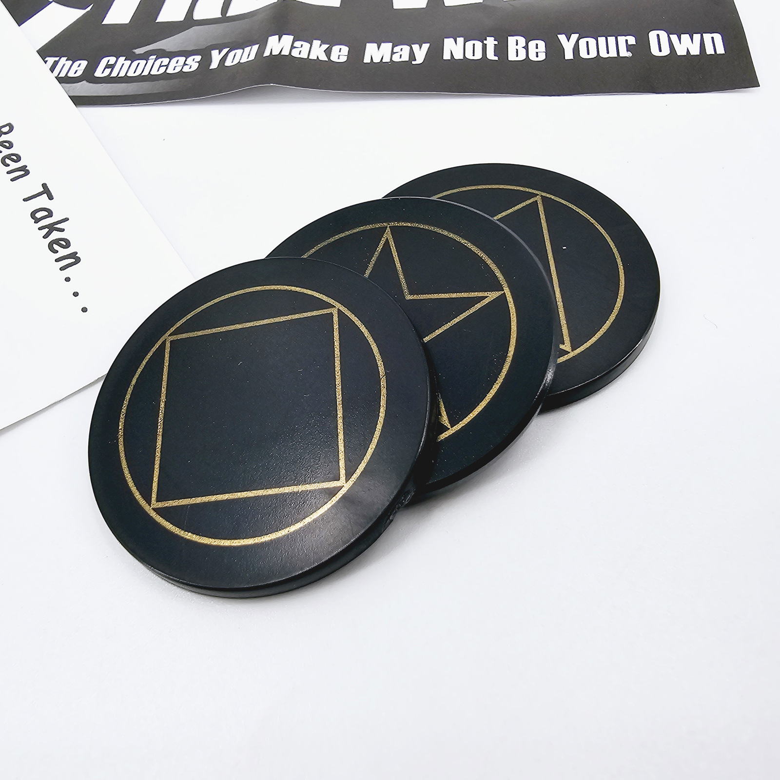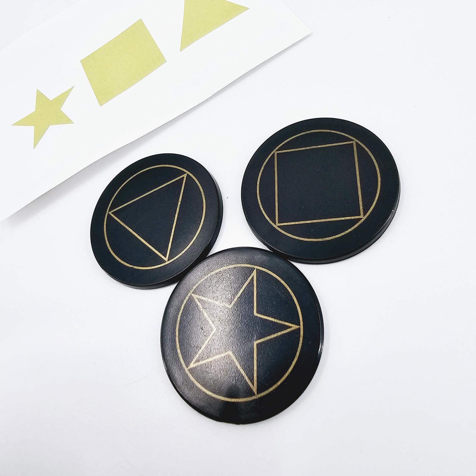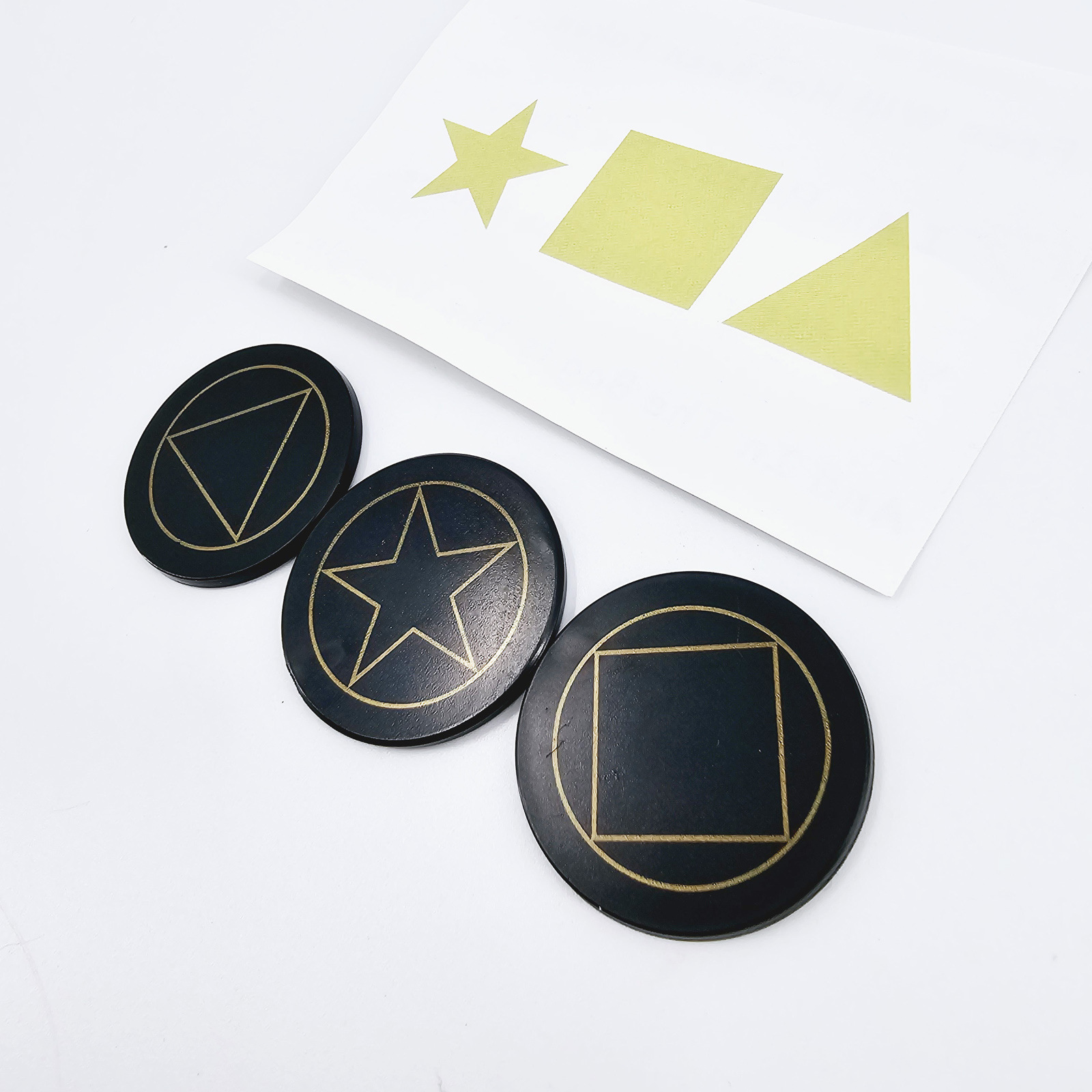 取出3张正面分别是三角(TRIANGLE)、方块(SQUARE)、五角星(STAR)背面都有一只眼睛的卡片和一张预言卡片(可以自己写).