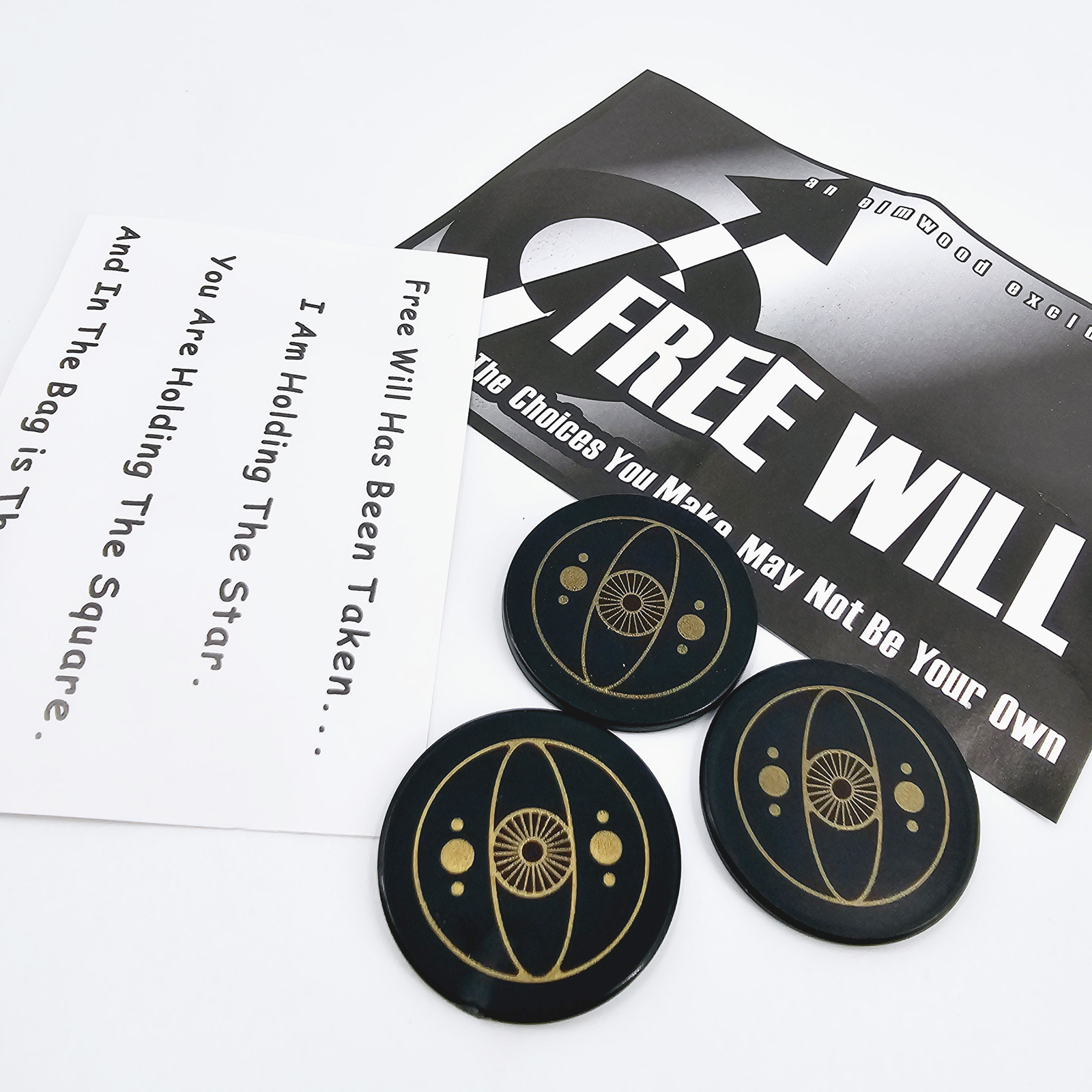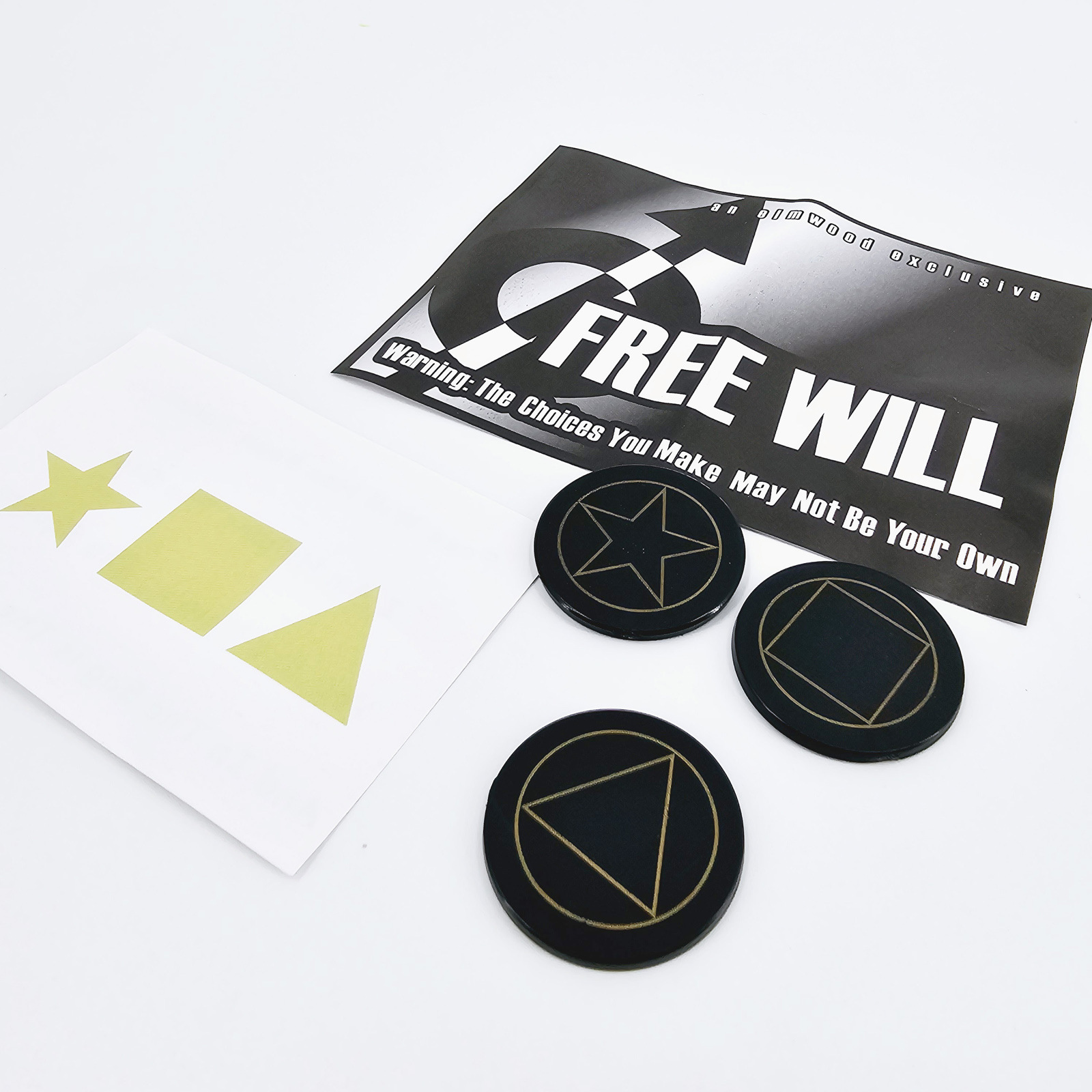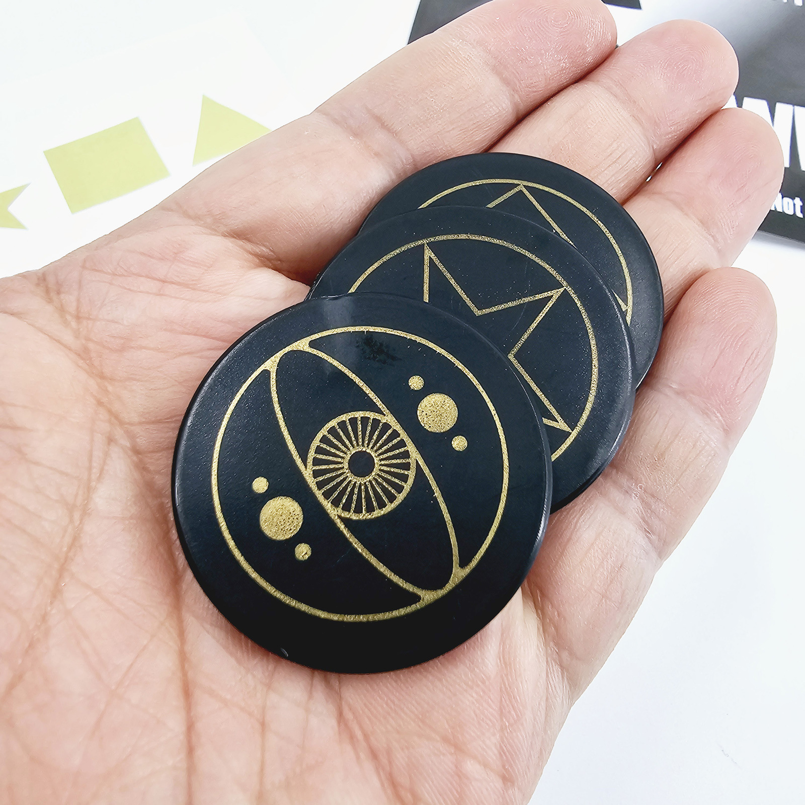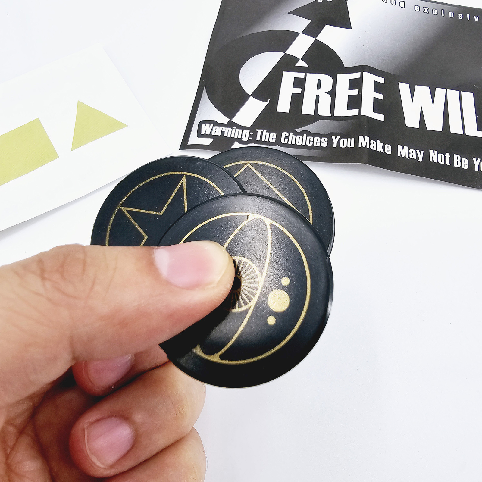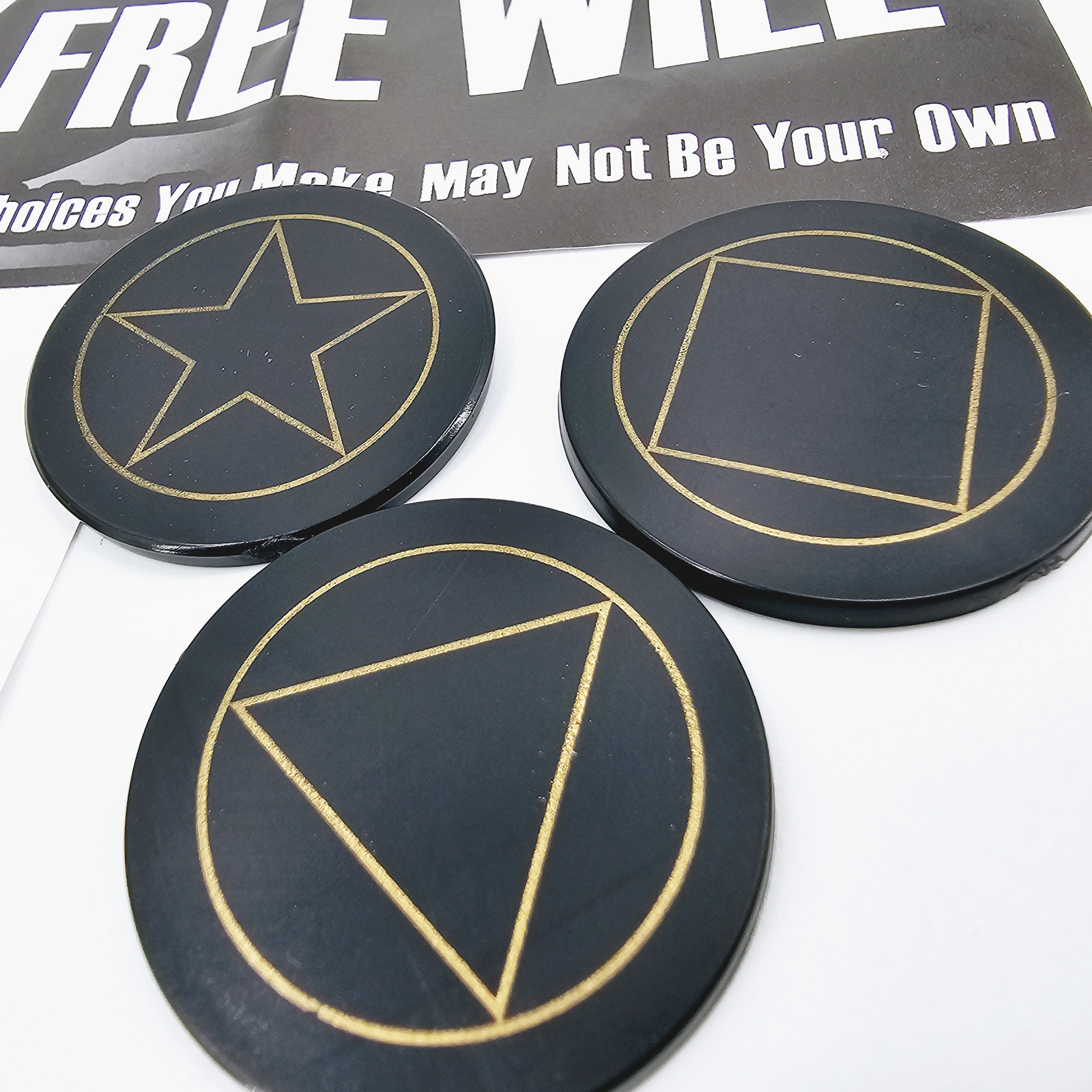 取出3张正面分别是三角(TRIANGLE)、方块(SQUARE)、五角星(STAR)背面都有一只眼睛的卡片和一张预言卡片(可以自己写).