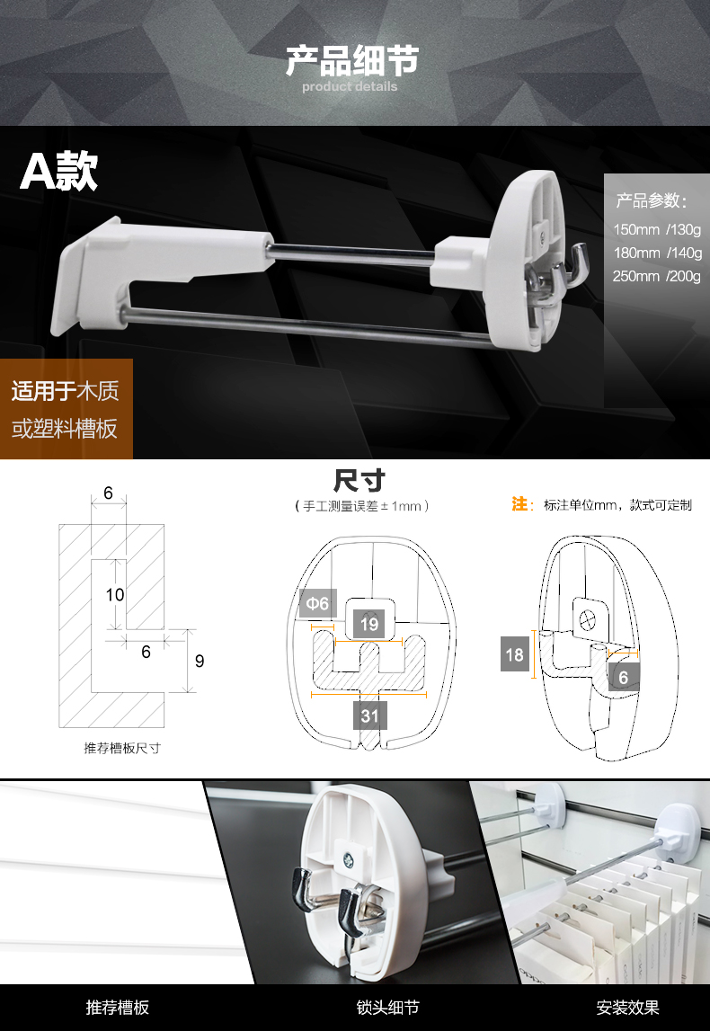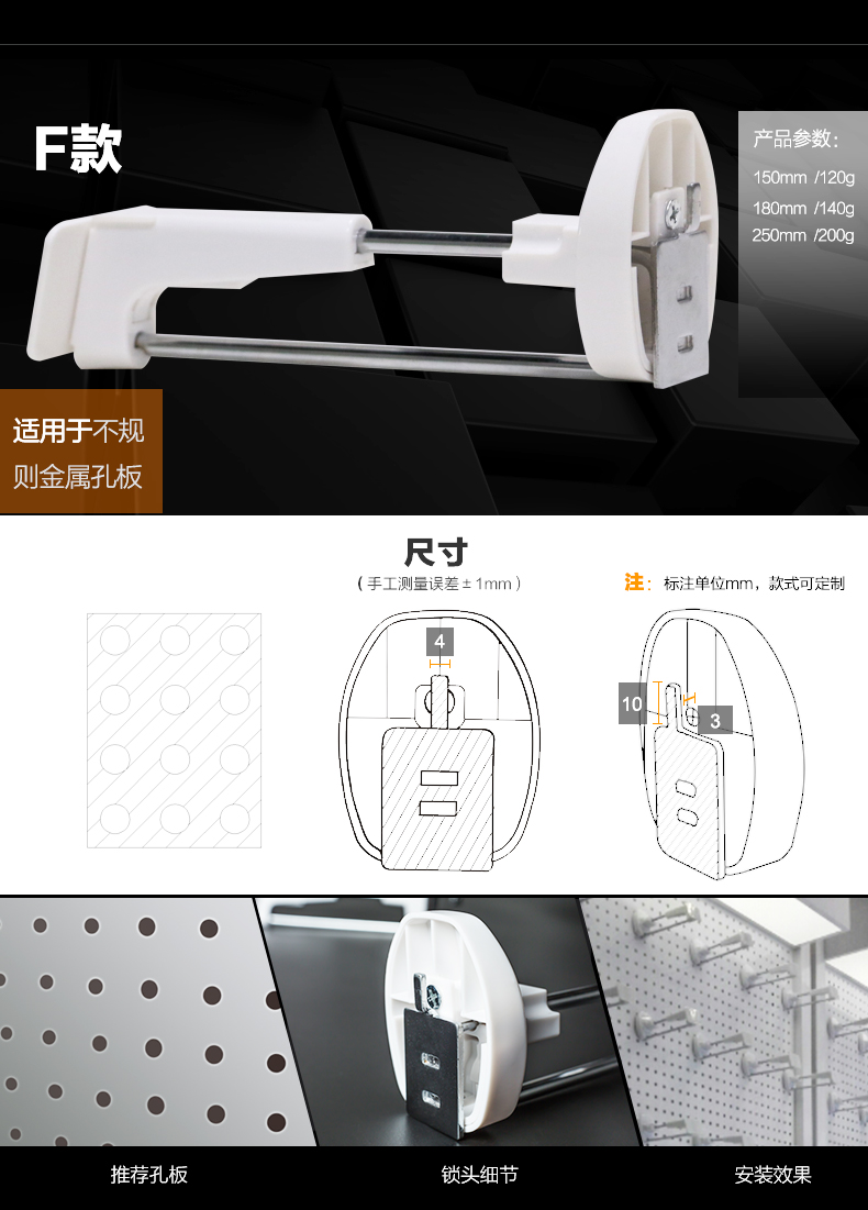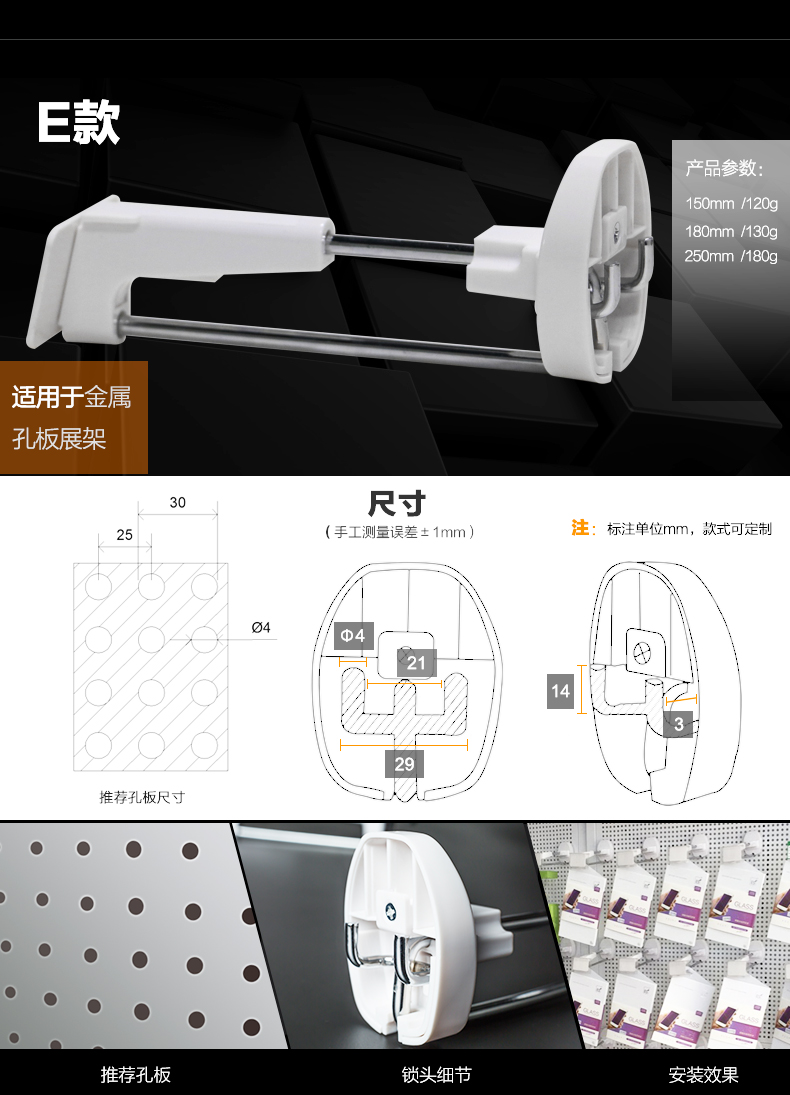 本品顾名思义,主要用于手机配件的展示多功能防盗陈列架,当然也适用于家电遥控器、电吹风、剃须刀等小家电的陈列,是一款适合商业超市陈列展示商品的展示墙上使用防盗挂钩。 值得注意的是其根据卖场展示需求不同,有六种接口,主要是A型常规型,适合卡槽板形背景板;其次是B型,即方管型,适合于用不锈钢管固定展示样品的卖场;再其次是C型,即Z字型,适合于有卡槽板的卖场展示商品(与A款功能相同),通俗的讲就是传统的卖场改造比较适合;最后是D型,即自攻螺丝型,适合于所有平面背景上,用自攻螺丝固定展示架,这款需要专业安装人员要不然会影响整体美观度,达到展示商品的效果。在上基础上我们根据现在展示市场的需求,将在A款的基础上进行了延伸开发,设计出了E款,适用于用金属孔板展示的展示墙,F款则是不规则金属孔板的背景墙。