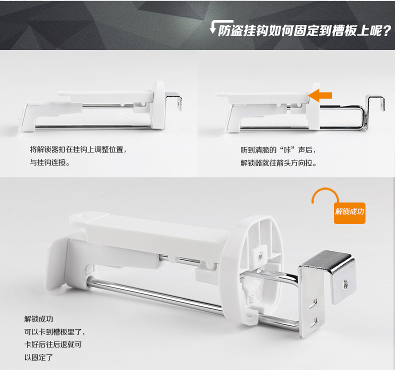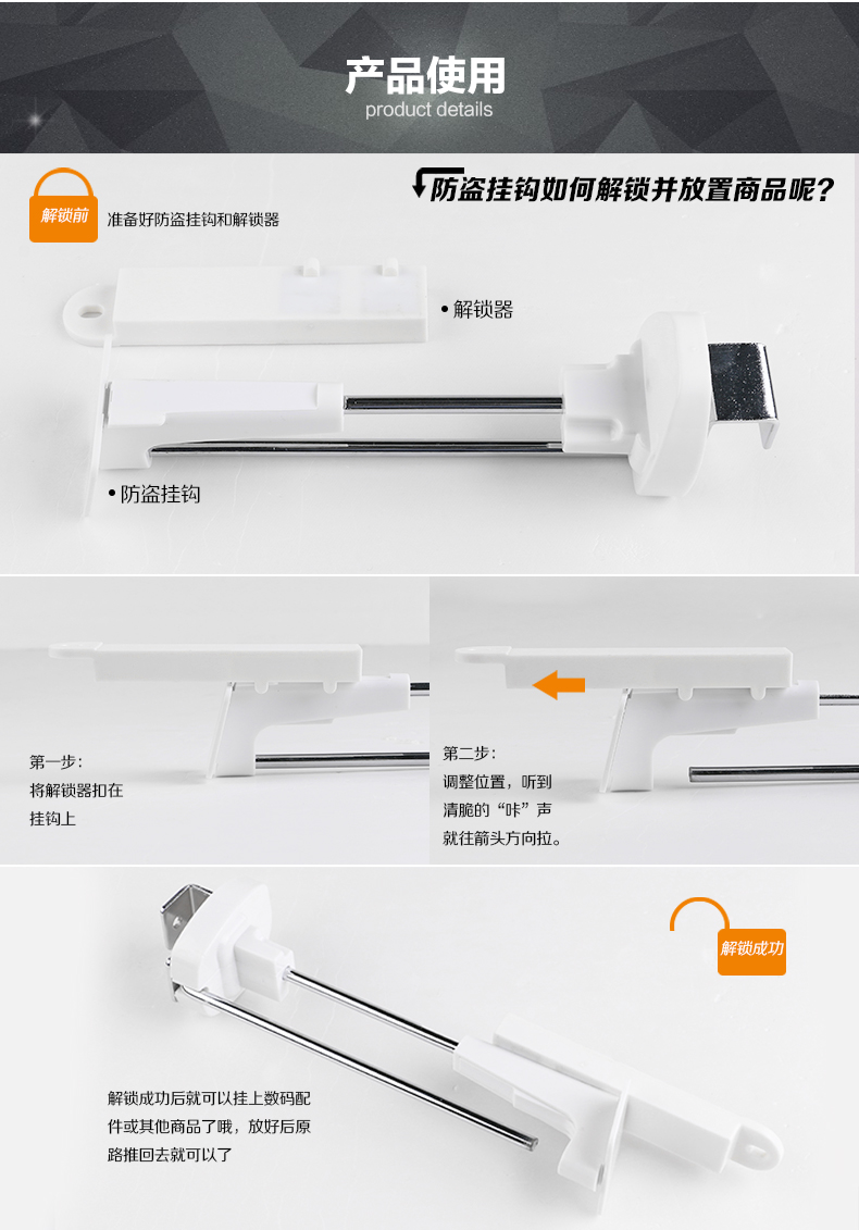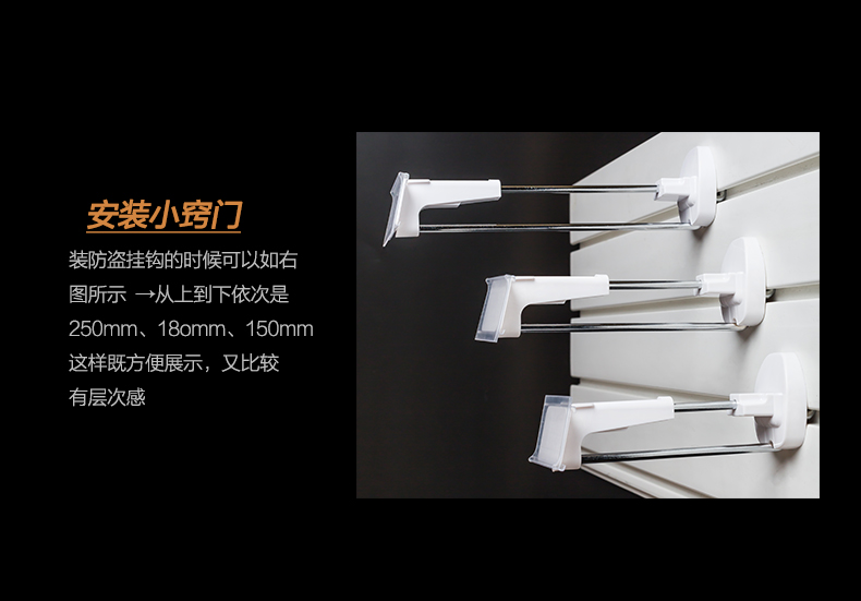 介绍:防盗挂钩,基于商品挂钩的基础上开发出来的一款更美观,具用机械防盗功能的陈列产品,主要适用于较贵重的小商品陈列展示,一般用于数码商场、手机专场店、体验式营销店铺、超市、会展等贵重物品墙挂陈列展示。夷希微防盗挂钩是由直径6mm的钢筋制作而成,坚固耐用,并采用优质钢材的弹跳原理制作机械防盗装置,需要我司开发专用解锁装置才能找开,大大提升防盗性能,是我司的一款专利产品,商品悬挂展示于墙壁,充分利用寸土寸金的展示位,有利用于营销空间。
