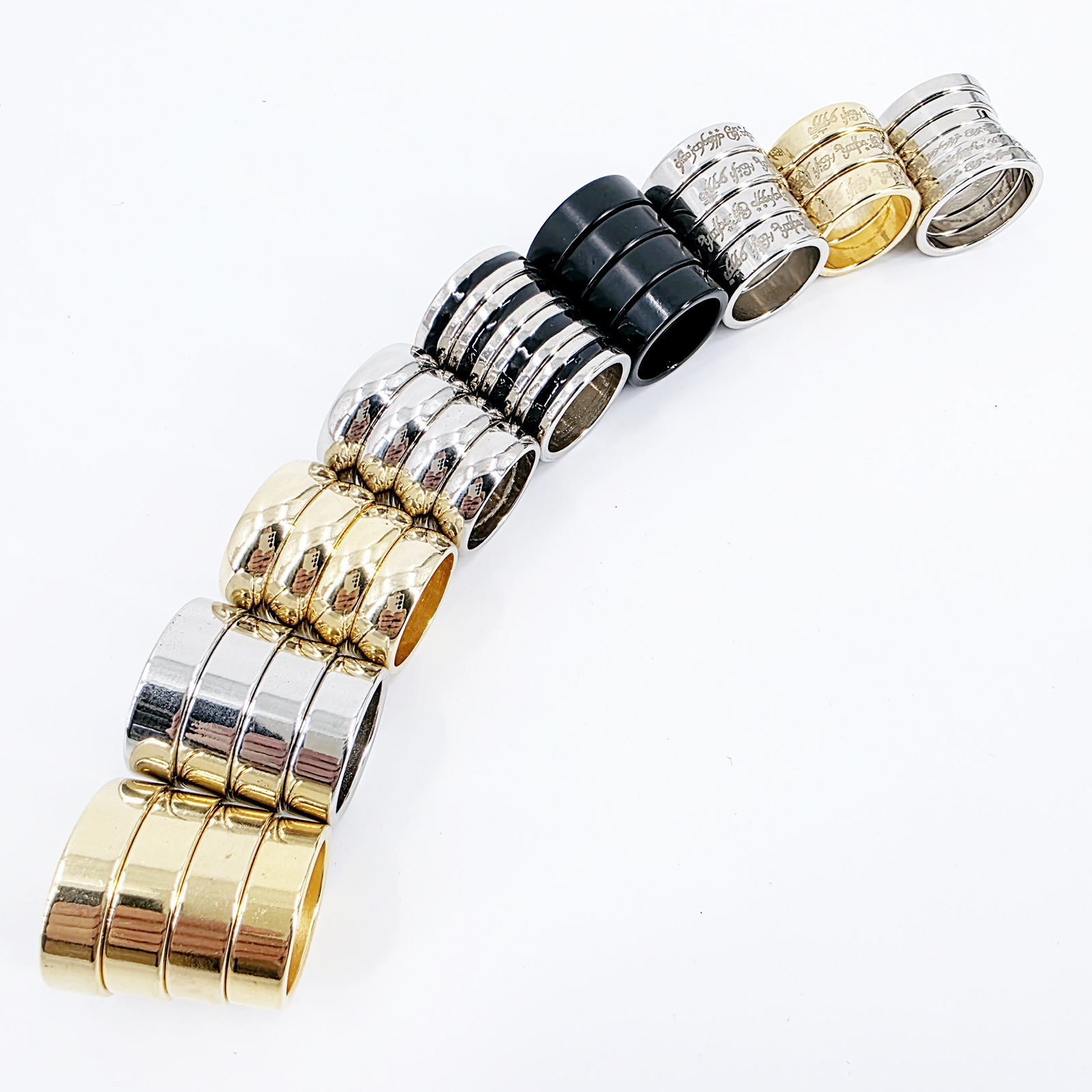 魔术师取出两个环,互相摩擦就可连接。两个连接的环再一摩擦即可分开。可以选择多个数量的环,表演三连环、四连环、六连环。此魔术为近景魔术携带方便。