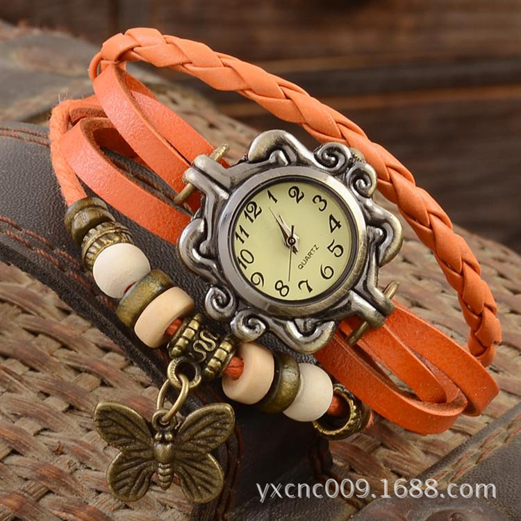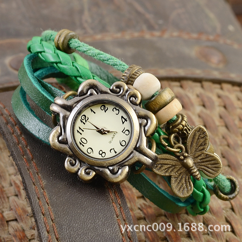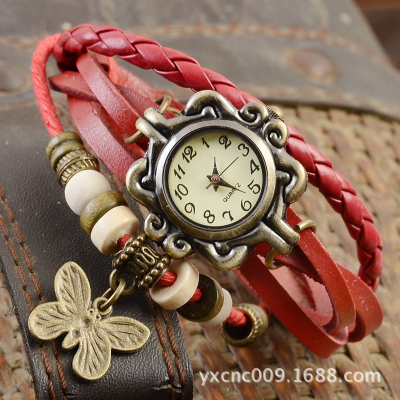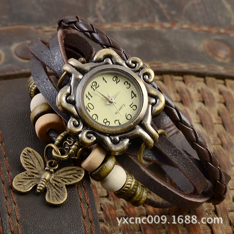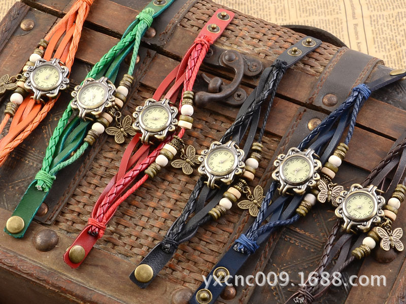 [工場直売] 頭層牛革レトロ手チェーン時計女性蝶ペンダント編み腕時計、現物卸売り