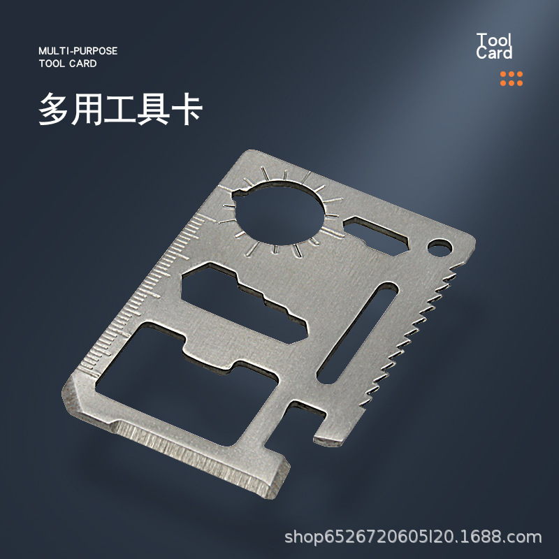 | 【产品简介】 本产品采用420优质不锈钢制作,做工精致,正反面均光亮平整,决无毛边,配图纸使用说明,刀刃锋利,钢体坚固,锯齿更 是在薄薄的卡片上采用双排交错齿。整块高硬度不锈钢一次成型,强度高,刃口锋利。规格比信用卡略小,外带黑色皮革保护 套,能够避免刃口伤及自身,并可放入钱夹随身携带。如此小巧实用的救生卡,在钱夹装一个或者在钥匙环上挂一个,不管是 居家过日子还是旅游,钓鱼,野营,都如同随时携带了一个简易的工具箱,您不想尝试一下吗? (如下图,) 1.罐头起子:下面的钩口同上面的刃口配合使用,可轻松开启铁皮罐头。 2.侧刀:刃口锋利,可切削绳索,洗净后削水果更不是问题。 3.螺丝起子:位于卡的一个角上(此位置利用了力学原理增加了强度并更加 省力),经科学角度切削成一字螺丝刀,能够松紧常用型号的螺丝。 4.直尺:采用公制刻度,最小刻度为mm。 5.瓶起子:适合啤酒、饮料等瓶子盖的开启。 6.定位扳手:四种不同型号的六棱扳手,适合日常所使用螺栓及螺母的大小。 7.活扳手:即长条状镂空槽,可以拧任何扁型薄厚不同的带螺丝扣的物品。 8.锯齿:双排交错锯齿,增加力度,提高效率,我不只用来锯木头树枝,去除 鱼鳞也是很好用的。 9.方向指示:可利用十六等分的刻度准确测定不同方向。 10.定位扳手:两种不同型号的六棱扳手,比功能6的型号小一些。 11.钥匙孔,可将此卡悬挂于钥匙环上。 |