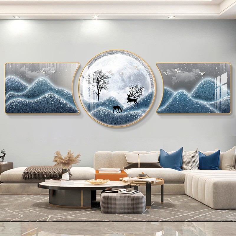 リビングルームの装飾画ソファーの背景の壁はヨーロッパ式の3連画を描いています。
