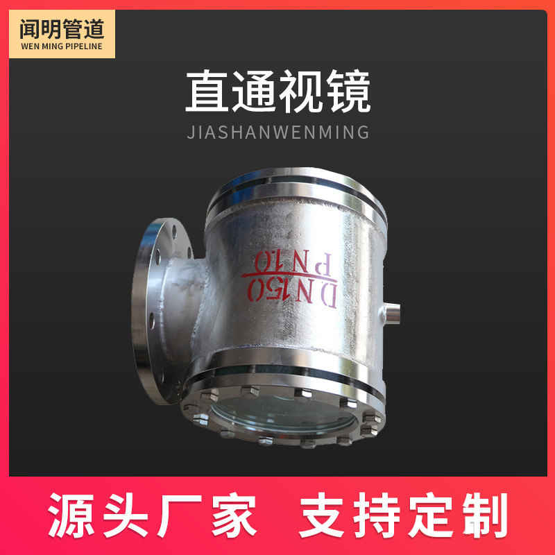 管道视镜是工业管道装置上的主要附件之一,通过它能随时观察管道中液体、气体、蒸汽等介质流动反应情况,监视生产,避免生产过程中事故发生。经常用于石油、化工、化纤、制药等生产管路中。