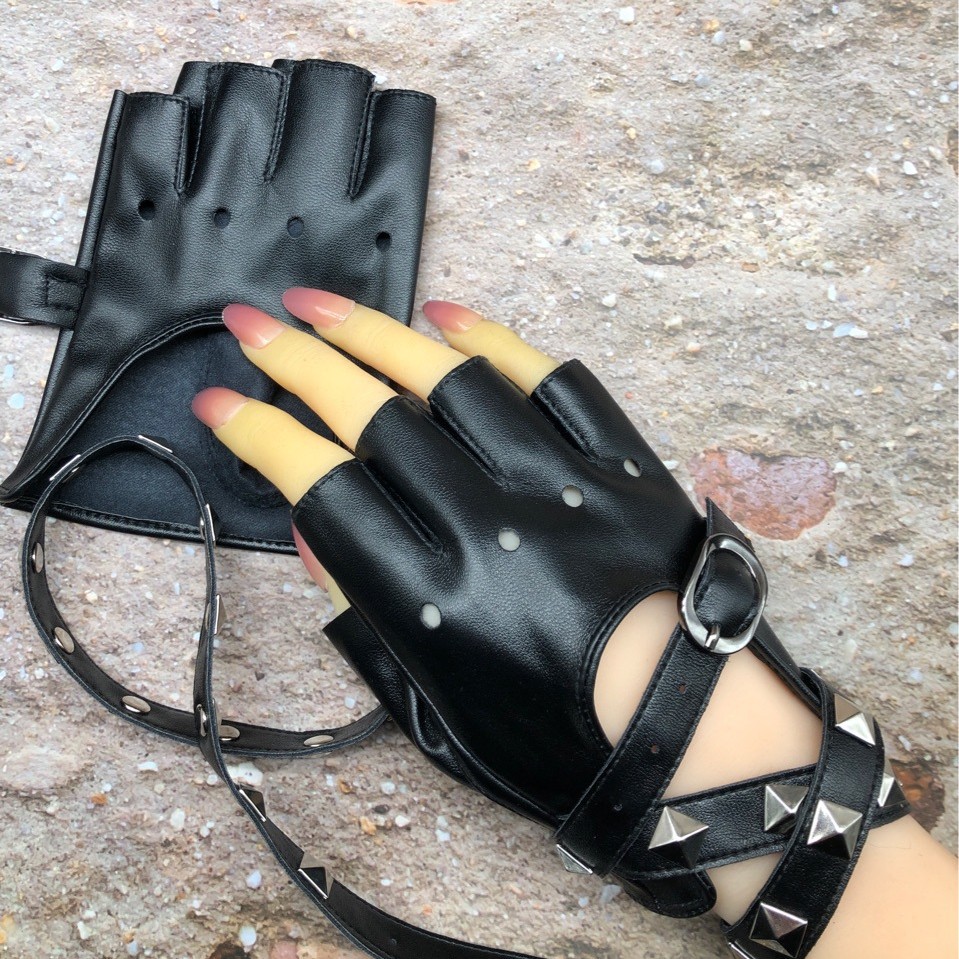 ハーフバイクロリータダンスゴシックサイバーパンクjkハーフフィンガーハーフパーム指なし執事レザーグローブ女性cos