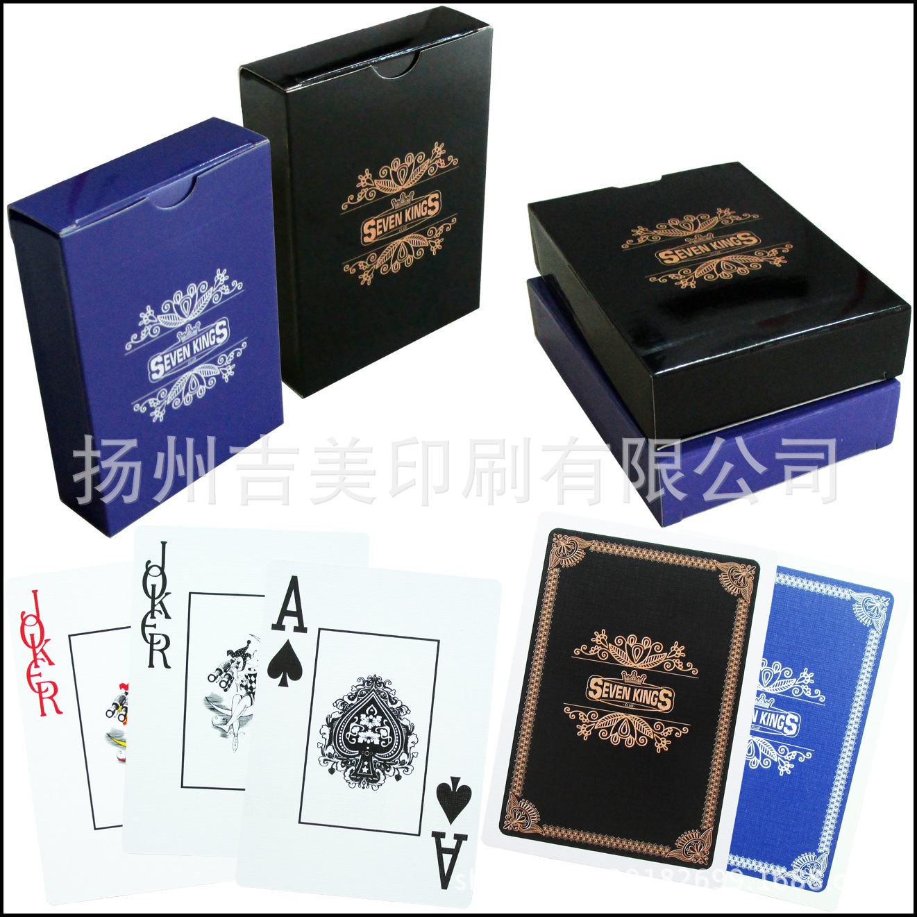 4)包装:常规德州为54张扑克+1张切卡装入纸彩盒, 10副(5红, 5蓝)入E瓦中装, 100副/外箱