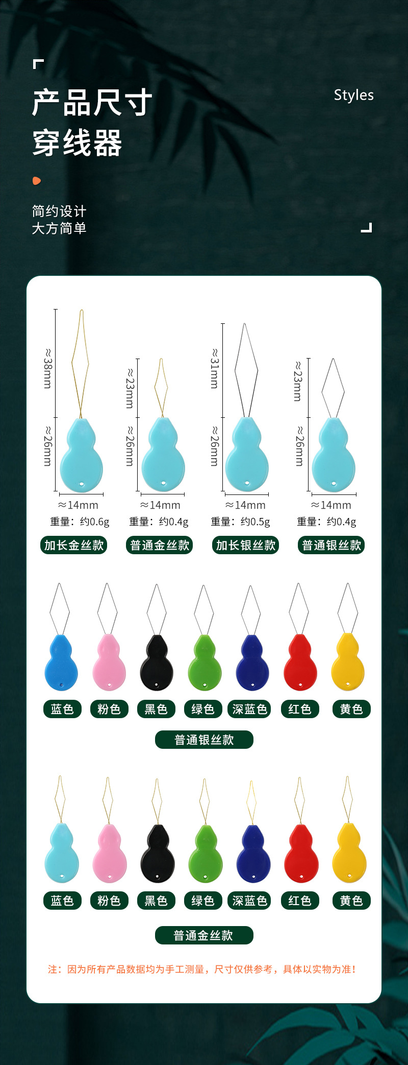 穿针器长50mm,加长款:钢丝针长34mm左右,宝贝的穿针为航天特殊钢丝,硬度强,不易弯曲,更不会掉针,即使是用尽您的一起去拉也不会掉,是居家必备的神器。单个约0.65g