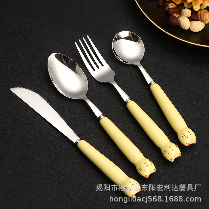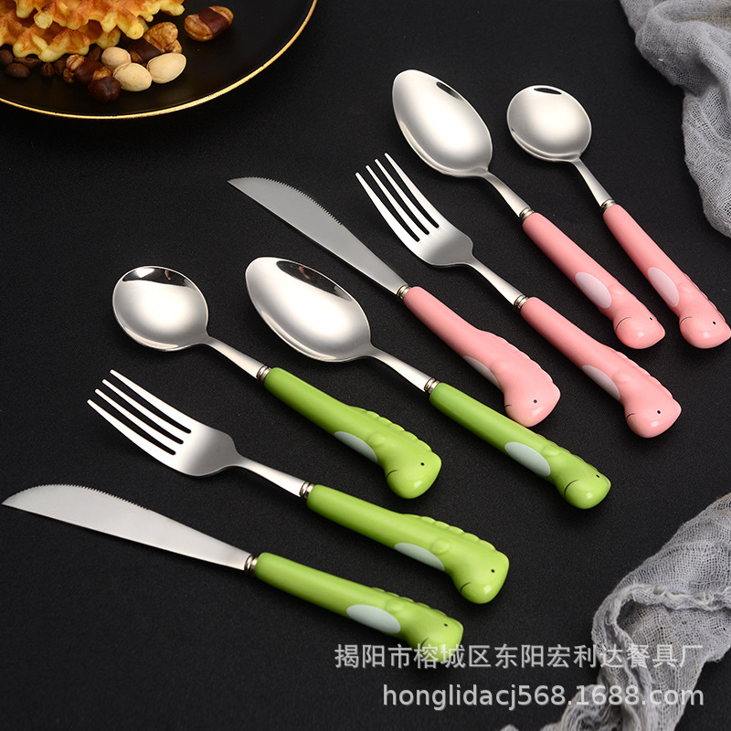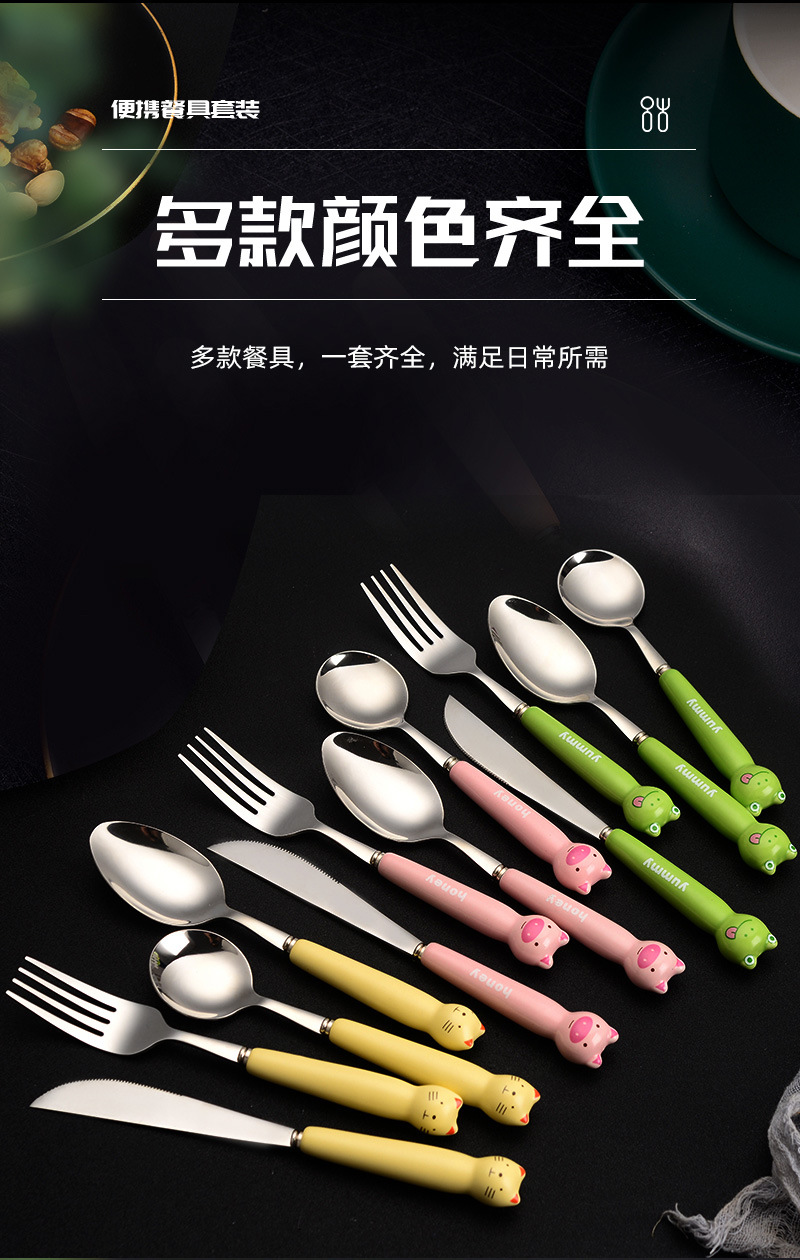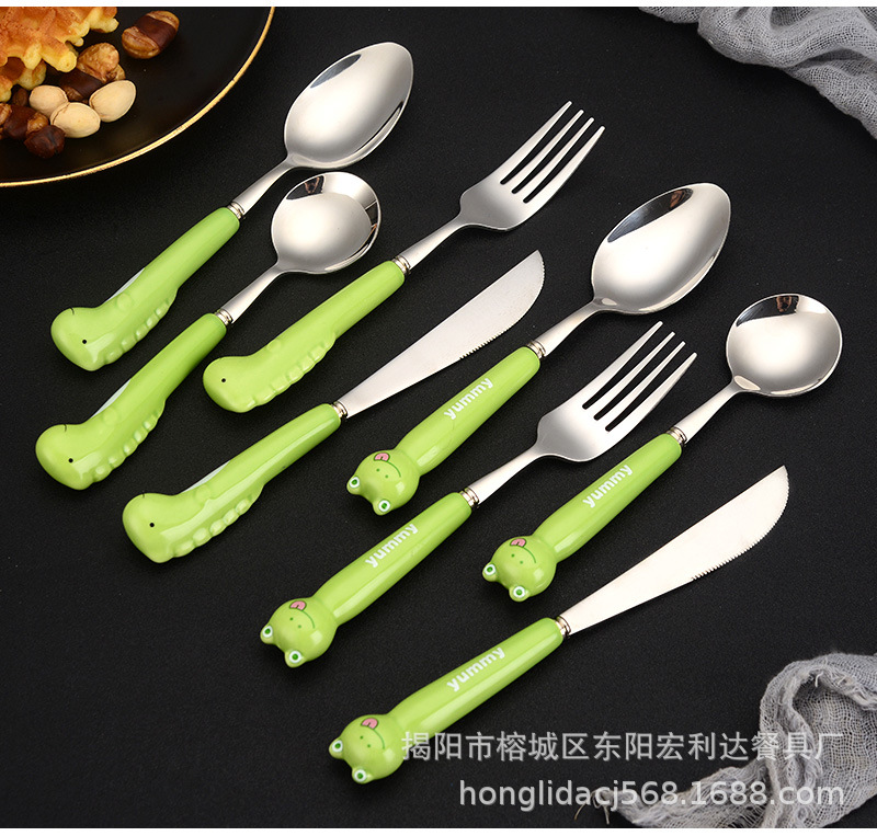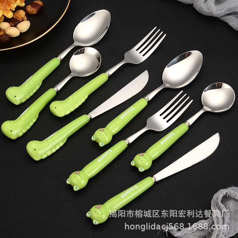 304ステンレス製食器 漫画風キュートでいたずらなカエル セラミックハンドル 洋食ナイフ・フォーク・スプーン 家庭用デザートナイフ・フォーク・スプーン