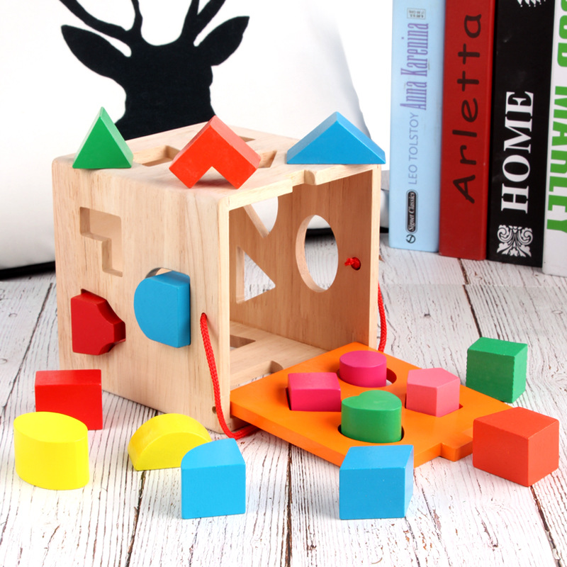 1、把智力盒打开,把各种形状的积木块拿出来,教宝宝认识不同的形状和颜色;小积木块和孔的大小不是一样的。其中小积木块是可以从孔中穿过去的。