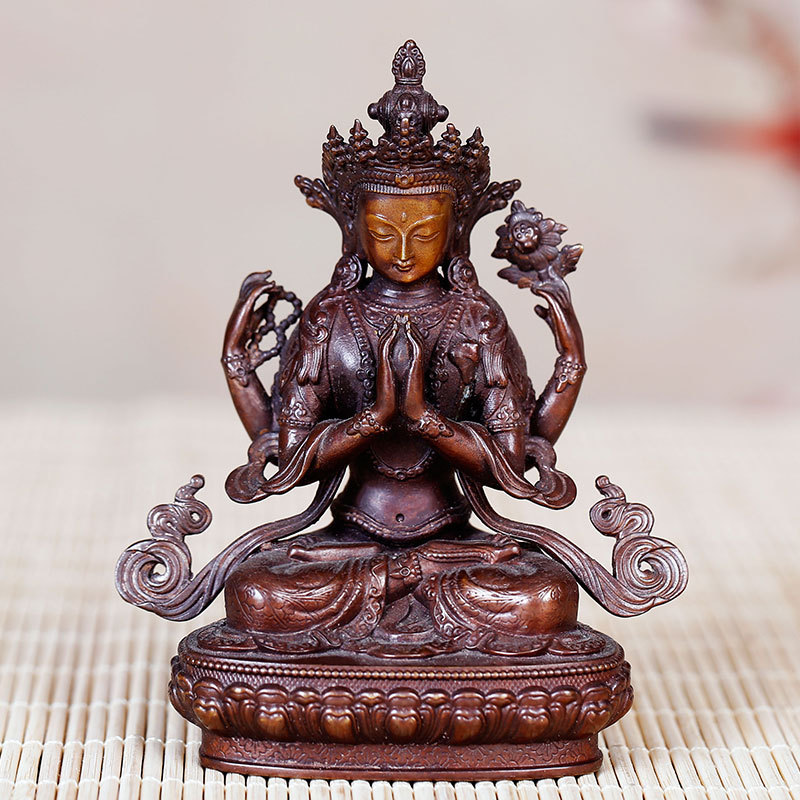 四臂观音是雪域西藏的守护神,藏人由老至幼家家户户,皆吟诵其六字大明咒:“嗡嘛呢叭咪吽”。广大藏蒙佛教徒还把喇嘛奉为观音化身, 四臂观音舆文殊菩萨、金刚手菩萨,合称三族姓尊.代表大悲、大智、大力,为密乘行者人人必修的法门。