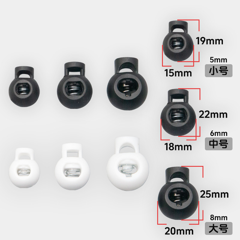 プラスチックスプリングバックル、球面スプリングバックル、丸ビーズ、単穴巾着キャップ、ロープバックル、黒と白の透明スプリングバックルを供給します。