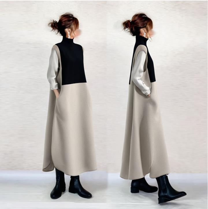 ティーブレイク風フレンチエレガントなフェイクツーピースワンピース 春秋新作 コーデュロイ素材 エレガントなウエストシェイプ 細見えロングスカート ハイウエスト